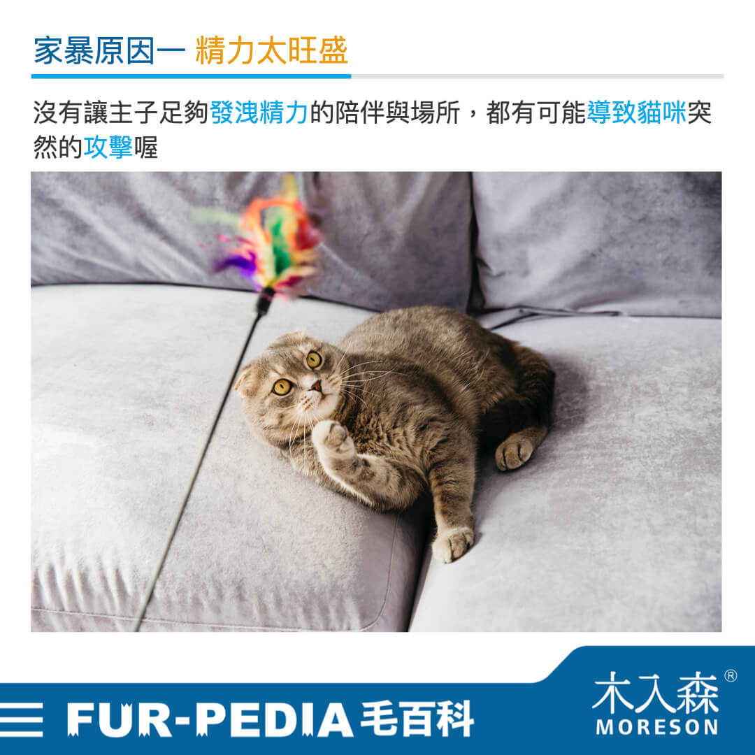 想要克服這樣的家暴問題,可以增加與貓咪玩耍的時間,使用玩具、逗貓棒玩10-15分鐘,每日2次,可以有效幫貓咪釋放精力;也可以多增加貓咪的活動空間,例如貓跳台、貓步道、貓抓板等,如果家裡不大,更需要多些垂直的空間讓貓咪跑跳玩耍;最後也可以選擇多養一隻貓咪,讓貓咪彼此有伴可以陪玩、釋放活力。這樣讓貓咪充足放電,確實可有效減少貓咪攻擊人的機會喔!