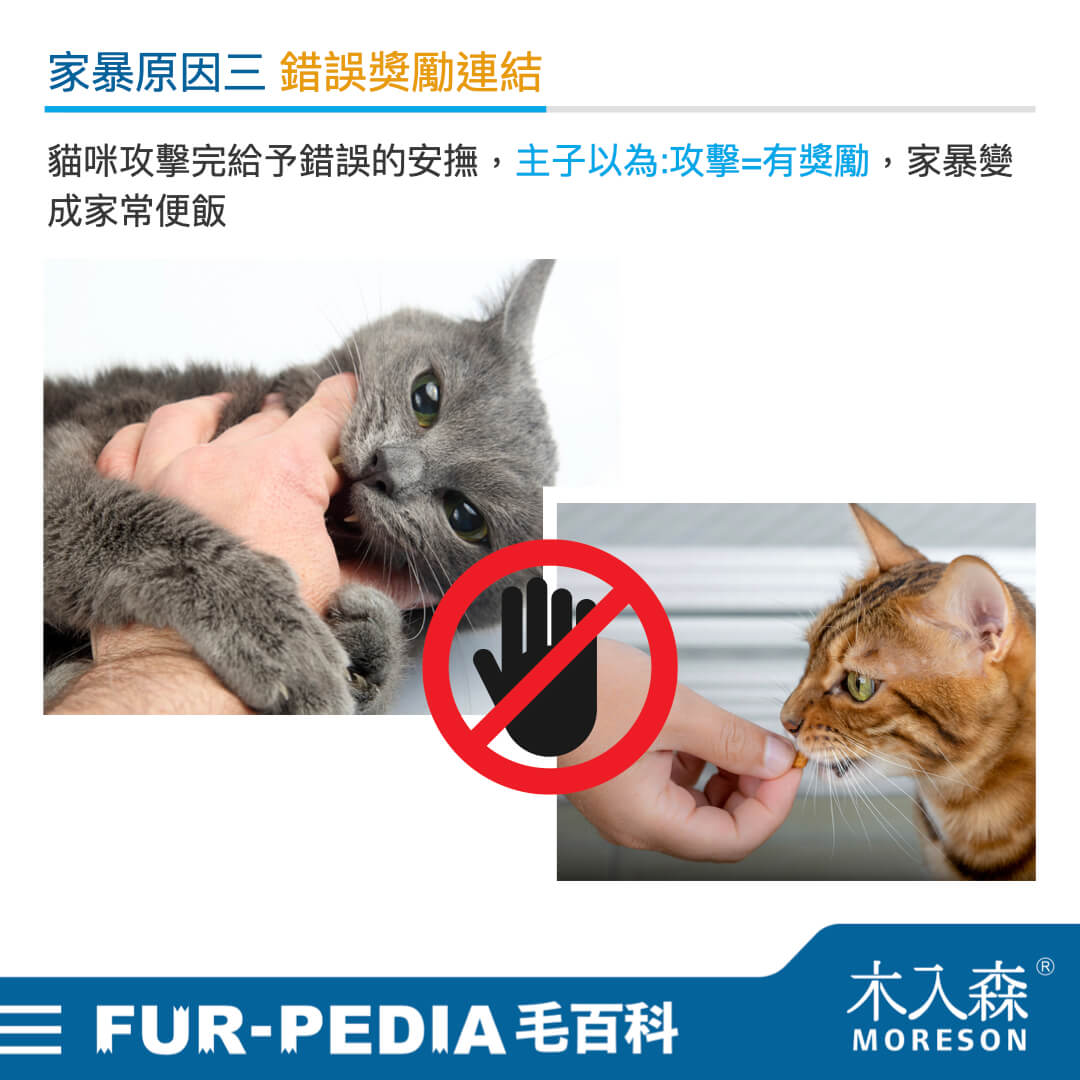有時候我們被貓咪攻擊、咬手腳,會自己腦補貓咪是不是不開心了? 或是以為貓咪想要玩耍? 結果為了哄貓咪開心給牠吃零食、為了讓貓咪轉移注意力開始拿逗貓棒等玩具陪牠遊戲。結果這樣的行為後果是,讓貓咪以為攻擊我們是有獎勵與好處的,我們的回饋讓牠產生我們是支持這種行為的想法,結果家暴依舊持續。