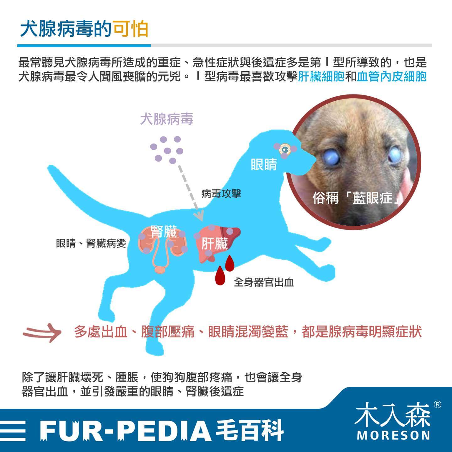 最常聽見犬腺病毒所造成的重症、急性症狀與後遺症多是第Ⅰ型所導致的,也是犬腺病毒最令人聞風喪膽的元兇。Ⅰ型病毒最喜歡攻擊肝臟細胞和血管內皮細胞,除了讓肝臟壞死、腫脹,使狗狗腹部疼痛,也會讓全身器官出血,並引發嚴重的眼睛、腎臟後遺症。