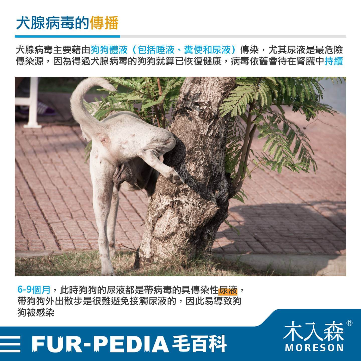 犬腺病毒主要藉由狗狗體液(包括唾液、糞便和尿液)傳染,尤其尿液是最危險傳染源,因為得過犬腺病毒的狗狗就算已恢復健康,病毒依舊會待在腎臟中持續6-9個月,此時狗狗的尿液都是帶病毒的具傳染性尿液,帶狗狗外出散步是很難避免接觸尿液的,因此易導致狗狗被感染。