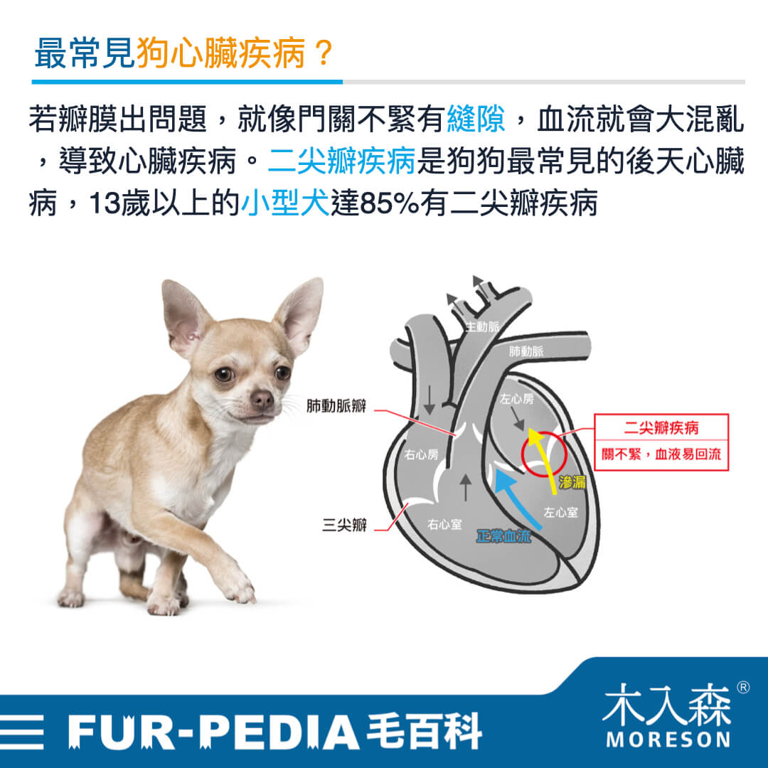 其實狗狗心臟病多是由瓣膜引起的,經統計,二尖瓣疾病(左心室和左心房間的瓣膜出問題)是狗狗最常見的後天心臟病,醫學病理又稱黏液性二尖瓣疾病(簡稱MMVD),舉例最容易有心臟病的犬種-馬爾濟斯,發現6歲以上的就有超過一半在超音波檢查下發現有二尖瓣疾病,而在13歲以上的小型犬有二尖瓣疾病的直接佔了85%,比例真的十分驚人。