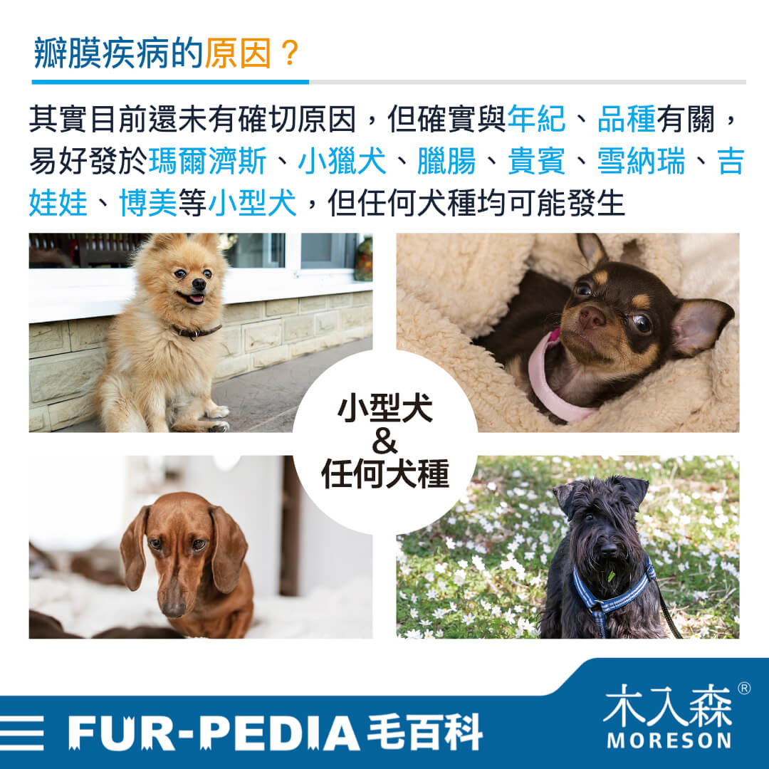 到底是什麼原因導致瓣膜關不緊呢? 其實到現在臨床醫學上也沒找到確切的原因,但確實與年紀、品種(基因)有關,常見於瑪爾濟斯、小獵犬、臘腸犬、迷你貴賓、約克夏、雪納瑞、吉娃娃、博美等小型犬,也算是台灣常見的大多小型犬種了,但二尖瓣疾病不專屬於小型犬,任何犬種還是皆可能發生,隨著狗狗年紀增加,瓣膜會原因不明地開始增厚、失去彈性,最後導致擋不住血流,長久下來就會形成心臟病、心衰竭。