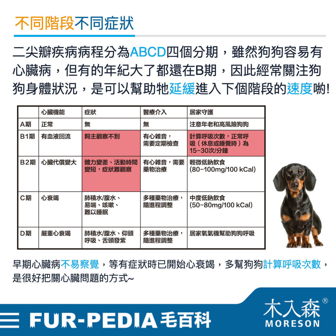 二尖瓣疾病的病程是有分不同階段的,為ABCD四個分期,每進入下一個階段,就代表心臟病更為嚴重,雖然狗狗們的心臟病風險真的高,但不是所有狗狗都會很快走到最後階段(嚴重心臟衰竭)的,例如有的狗狗15歲了都還維持B期,但有的可能8歲時已經到了C期,所以及早認識狗狗心臟病,經常關注狗狗身體狀況,是可以幫助牠延緩進入下個階段的速度喲!