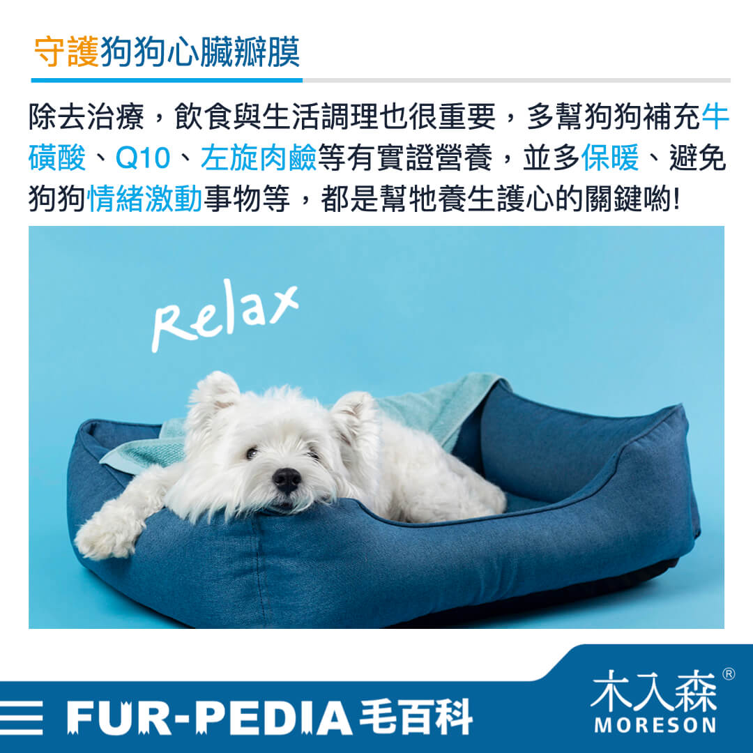 當狗狗有瓣膜疾病時,除了定期回診檢查、藥物調整,飲食與生活調理也很重要,可以多幫狗狗補充已有文獻證實可幫助延緩瓣膜疾病及維持心臟機能的營養,包含牛磺酸、Q10、鎂、左旋肉鹼和Omega-3脂肪酸等,同時避免跑跳劇烈的運動、變天注意保暖、避開易讓狗狗情緒激動事物、不要讓牠處在巨大雜音環境等,提供給狗狗類似”養老”的舒適生活空間,也都能幫助牠安穩不受刺激,有效守護心臟,就是幫狗狗延長壽命的秘訣喔!