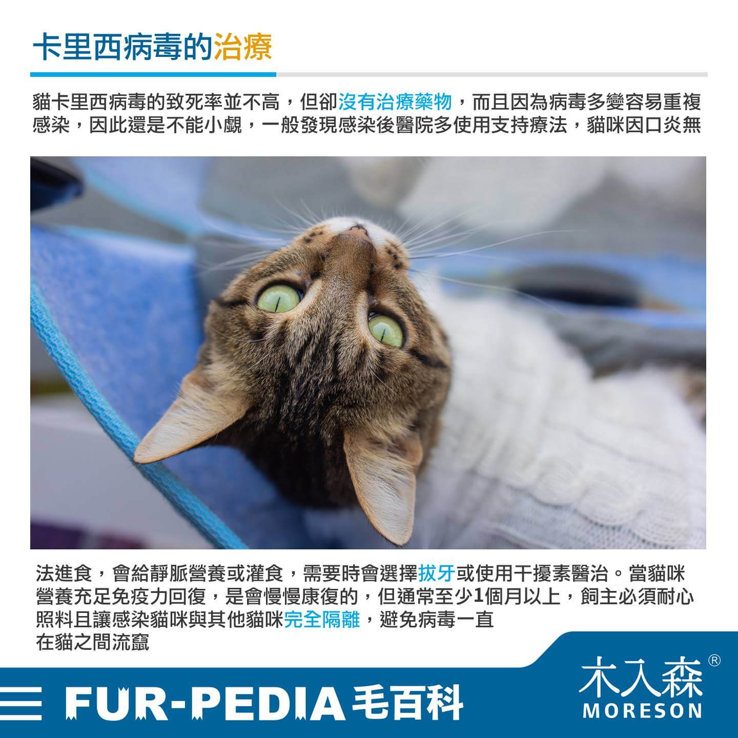 貓卡里西病毒的致死率並不高,但卻沒有治療藥物,而且因為病毒多變容易重複感染,因此還是不能小覷,一般發現感染後醫院多使用支持療法,貓咪因口炎無法進食,會給靜脈營養或灌食,需要時會選擇拔牙或使用干擾素醫治。