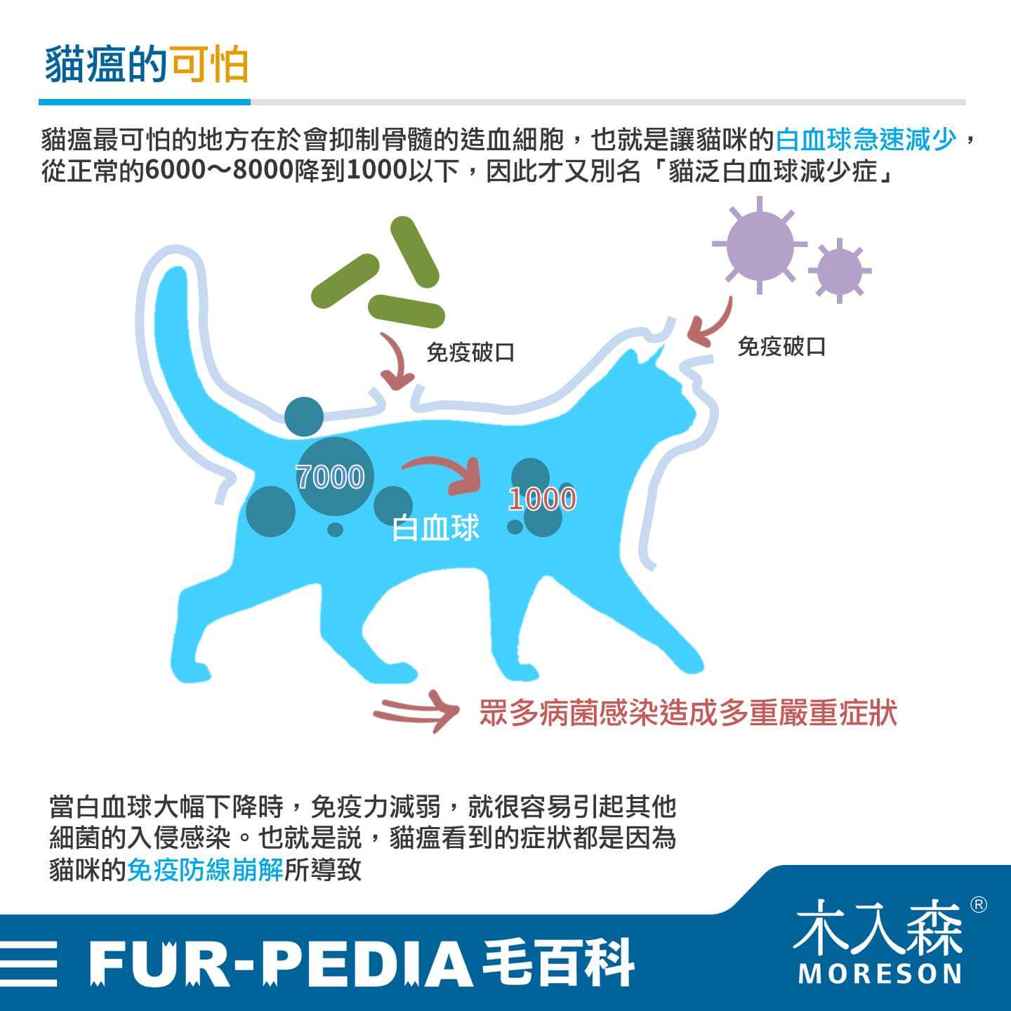 貓瘟最可怕的地方在於會抑制骨髓的造血細胞,也就是讓貓咪的白血球急速減少,從正常的6000~8000降到1000以下,因此才又別名「貓泛白血球減少症」。當白血球大幅下降時,免疫力減弱,就很容易引起其他細菌的入侵感染。也就是說,貓瘟看到的症狀都是因為貓咪的免疫防線崩解所導致。