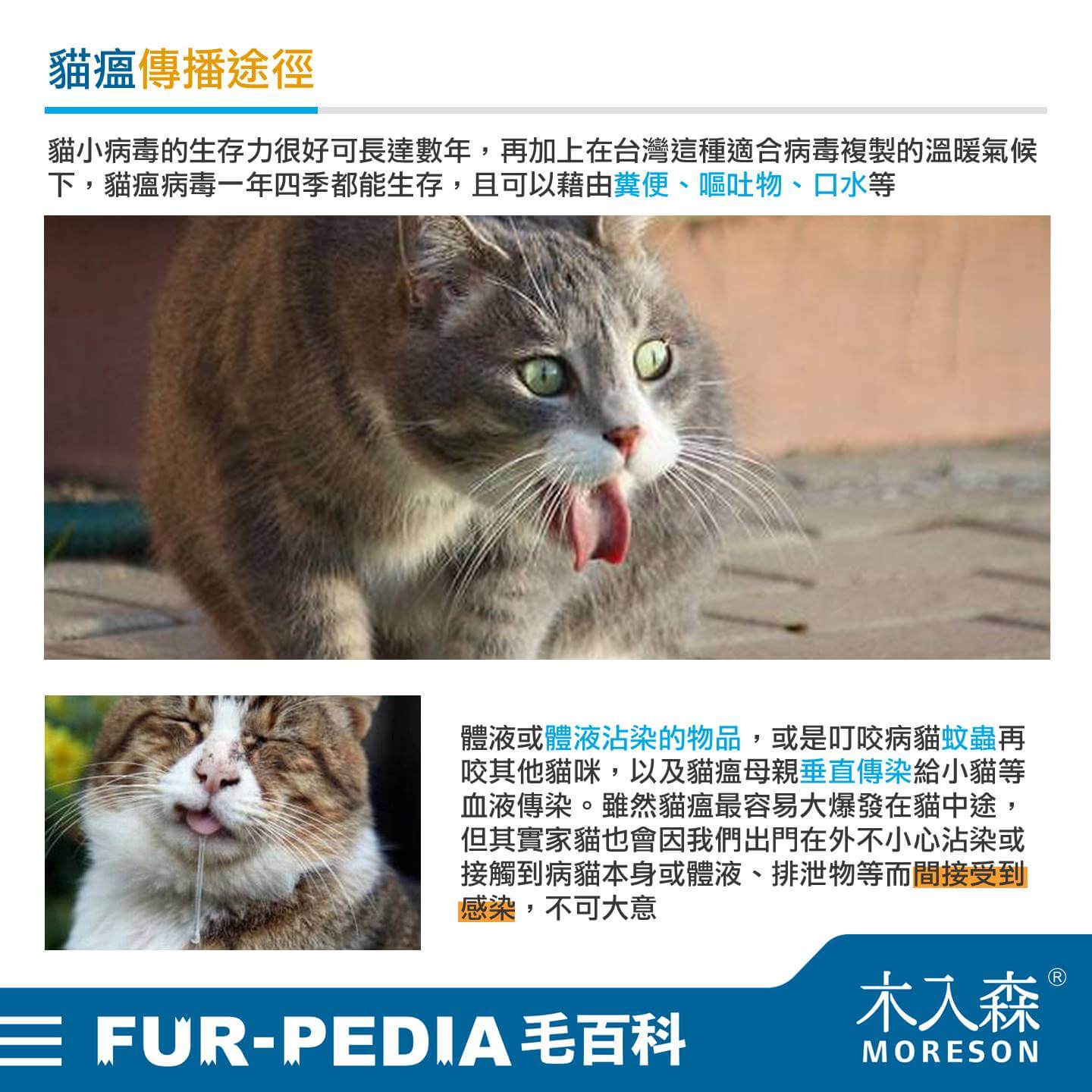 貓小病毒的生存力很好可長達數年,再加上在台灣這種適合病毒複製的溫暖氣候下,貓瘟病毒一年四季都能生存,且可以藉由糞便、嘔吐物、口水等體液或體液沾染的物品,或是叮咬病貓蚊蟲再咬其他貓咪,以及貓瘟母親垂直傳染給小貓等血液傳染。雖然貓瘟最容易大爆發在貓中途,但其實家貓也會因我們出門在外不小心沾染或接觸到病貓本身或體液、排泄物等而間接受到感染,不可大意。