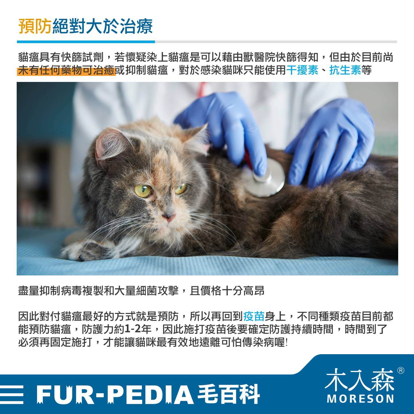 貓瘟具有快篩試劑,若懷疑染上貓瘟是可以藉由獸醫院快篩得知,但由於目前尚未有任何藥物可治癒或抑制貓瘟,對於感染貓咪只能使用干擾素、抗生素等盡量抑制病毒複製和大量細菌攻擊,且價格十分高昂。因此對付貓瘟最好的方式就是預防,所以再回到疫苗身上,不同種類疫苗目前都能預防貓瘟,防護力約1-2年,因此施打疫苗後要確定防護持續時間,時間到了必須在固定施打,才能讓貓咪最有效地遠離可怕傳染病喔