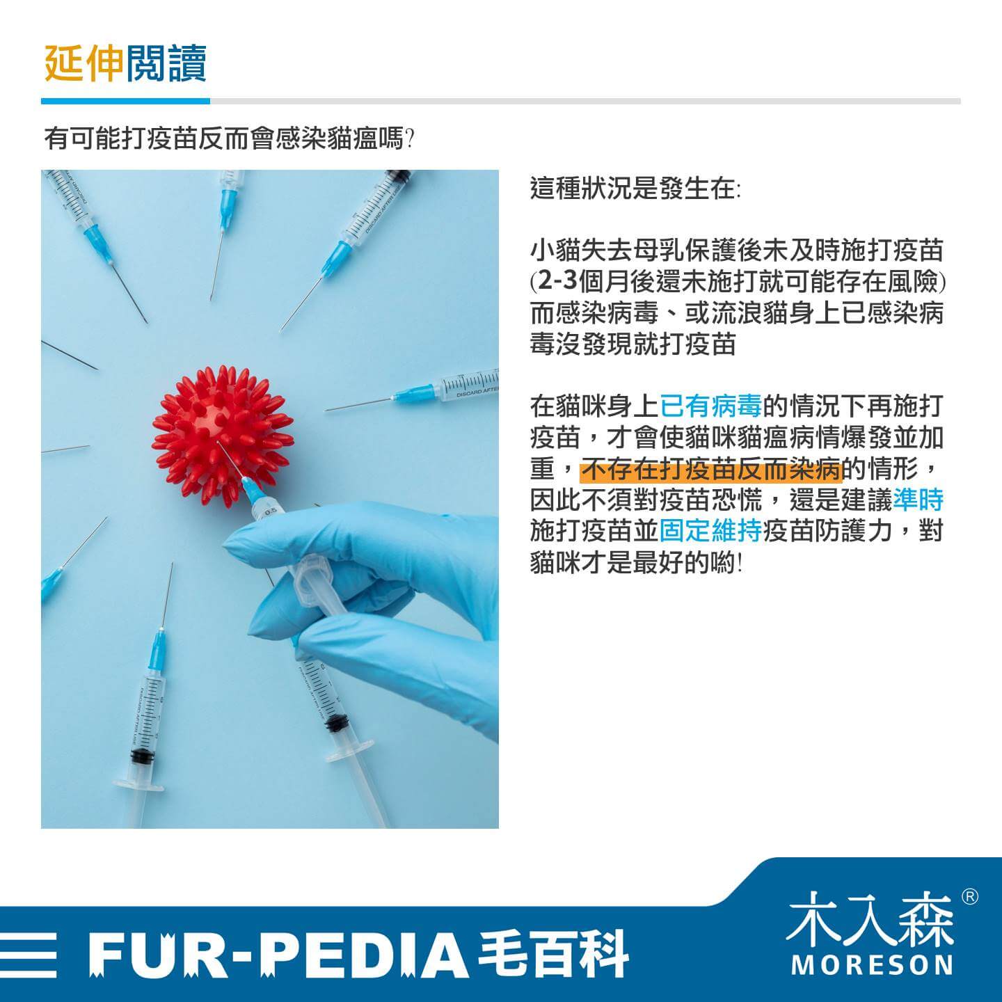 那有可能打疫苗反而會感染貓瘟嗎? 這種狀況是發生在小貓失去母乳保護後未及時施打疫苗(2-3個月後還未施打就可能存在風險)而已感染病毒,或流浪貓身上已感染病毒沒發現,在貓咪身上已有病毒的情況下再施打疫苗,才會使貓咪貓瘟病情爆發並加重,不存在打疫苗反而染病的情形,因此不須對疫苗恐慌,還是建議準時施打疫苗並固定維持疫苗防護力,對貓咪才是最好的喲!