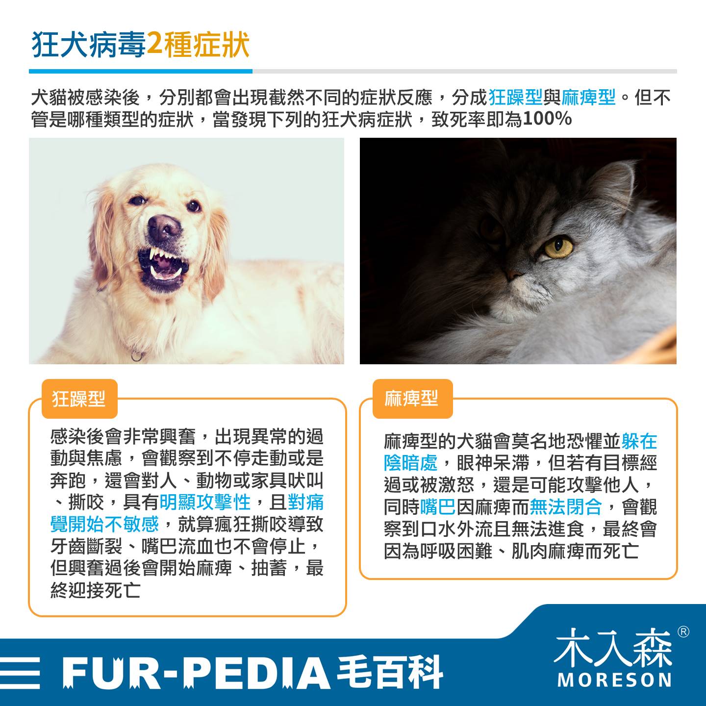 犬貓被感染後,分別都會出現截然不同的症狀反應,分成狂躁型與麻痺型。但不管是哪種類型的症狀,當發現下列的狂犬病症狀,致死率即為100%。