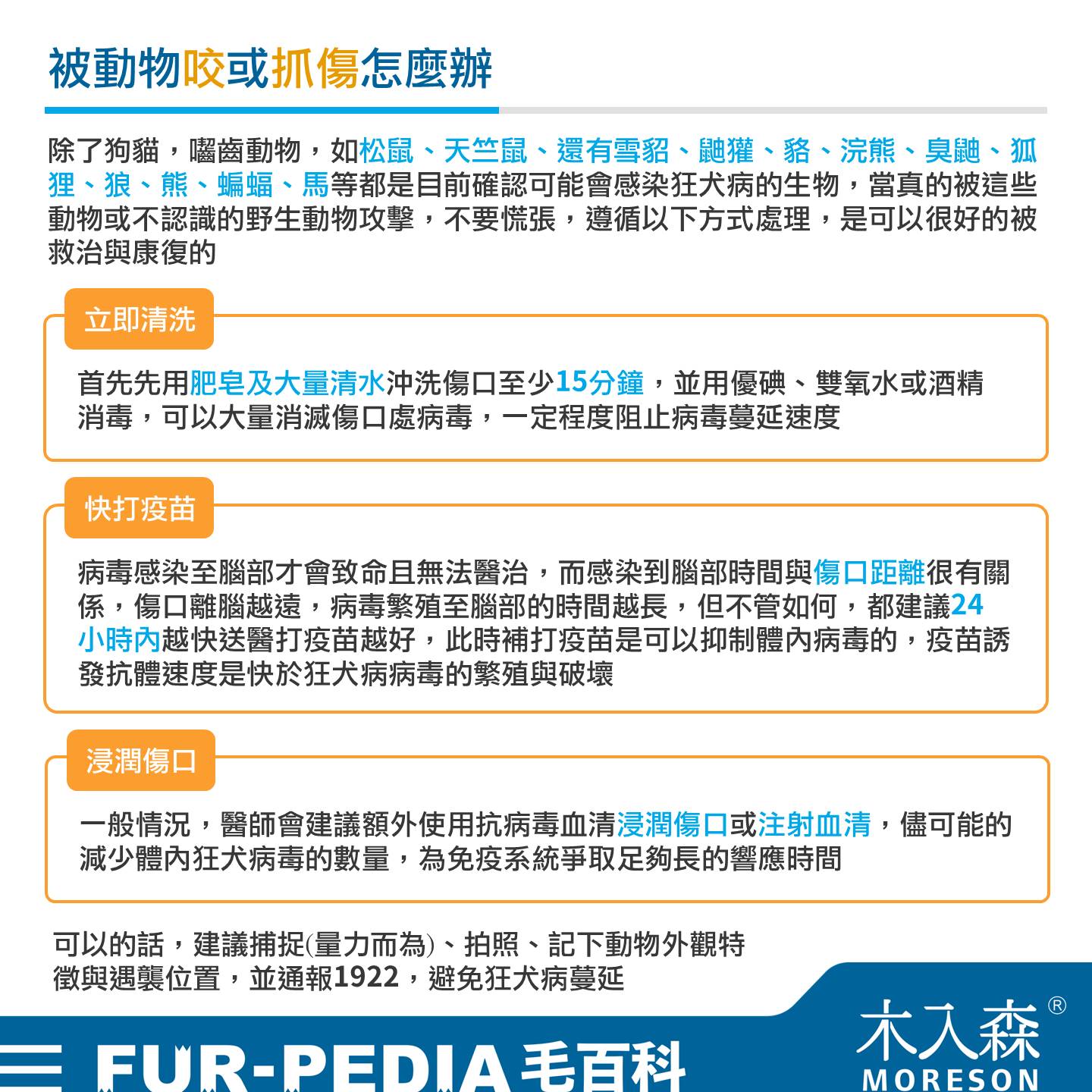 除了狗貓,囓齒動物,如松鼠、天竺鼠、還有雪貂、鼬獾、貉、浣熊、臭鼬、狐狸、狼、熊、蝙蝠、馬等都是目前確認可能會感染狂犬病的生物,當真的被這些動物或不認識的野生動物攻擊,不要慌張,遵循以下方式處理,是可以很好的被救治與康復的