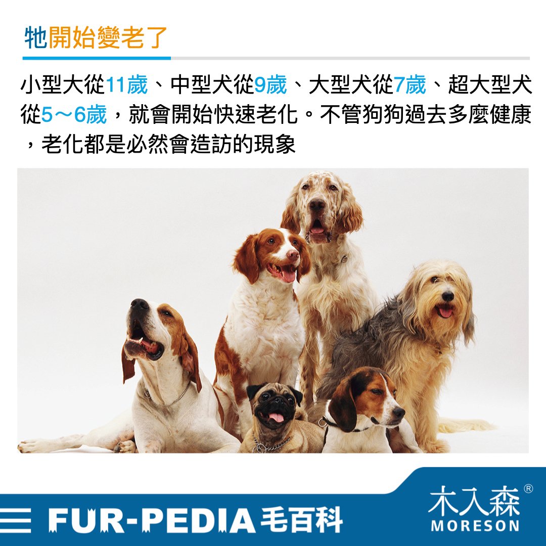 一般而言,小型大從 11 歲起、中型犬從 9 歲起、大型犬從 7 歲起、超大型犬從 5~6 歲起,就會開始快速老化。