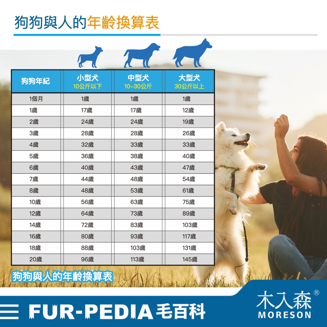 | 狗狗年紀 | 小型犬 10公斤以下 | 中型犬 10-30公斤 | 大型犬 30公斤以上 |