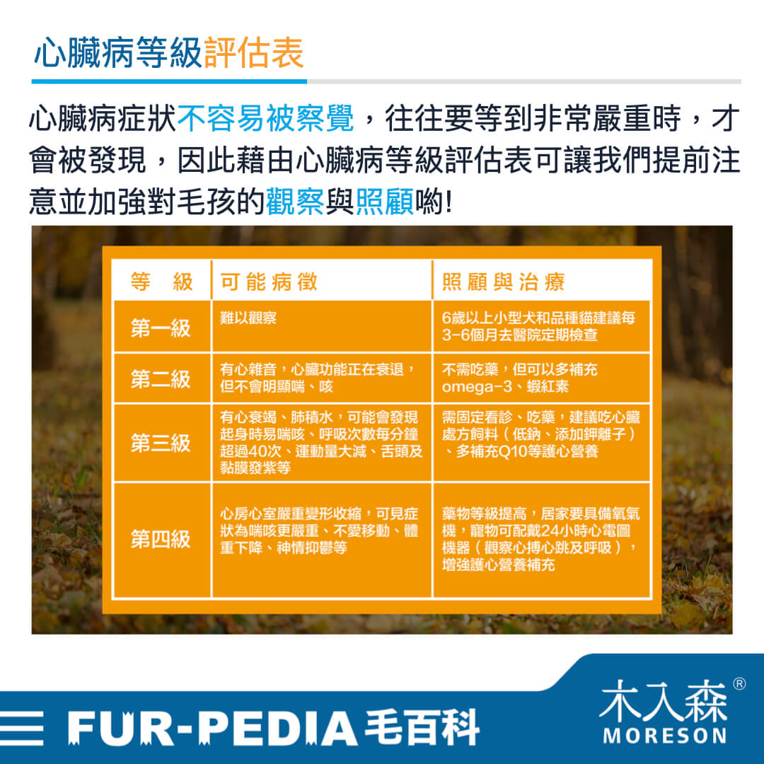 心臟病的症狀並不容易被察覺,往往要等到症狀非常嚴重時,才會被飼主發現,因此藉由心臟病等級評估表可以讓我們提前注意並加強對毛孩的觀察與照顧喲!也能幫助避免急性心臟問題造成身體嚴重傷害或難以招架的遺憾。