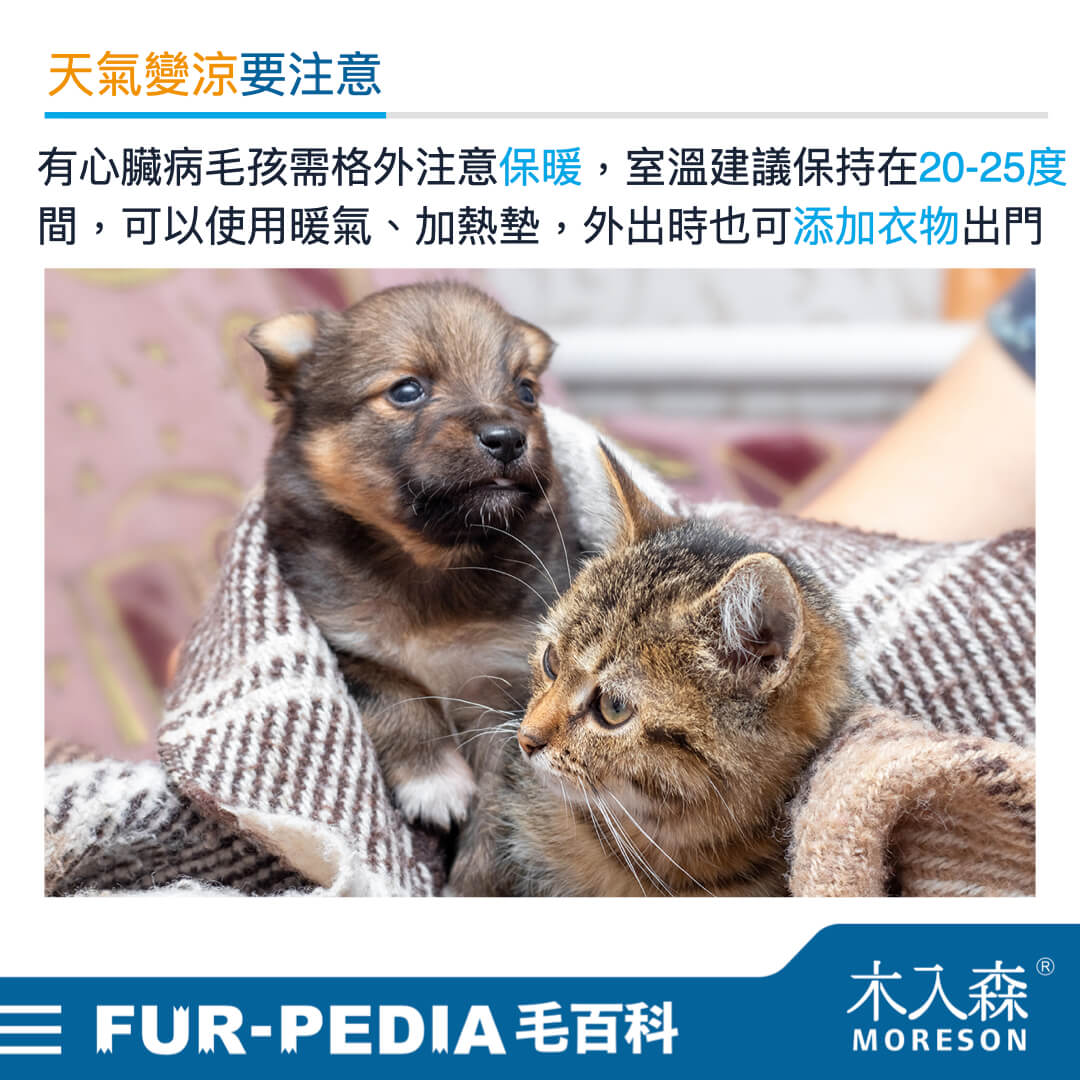 有心臟病的毛孩需要格外注意保暖,室內溫度建議保持在20-25度之間,可以使用暖氣、加溫器保持室內溫暖,提供毛巾包裹的加熱墊給毛孩躺也是不錯的選擇,當天氣微涼、風大時會外出的話,可以幫寶貝添加衣物,但不建議在室內仍穿著衣服,因為衣服在毛孩身上太久,反而容易讓皮膚不透氣而敏感發癢喔!