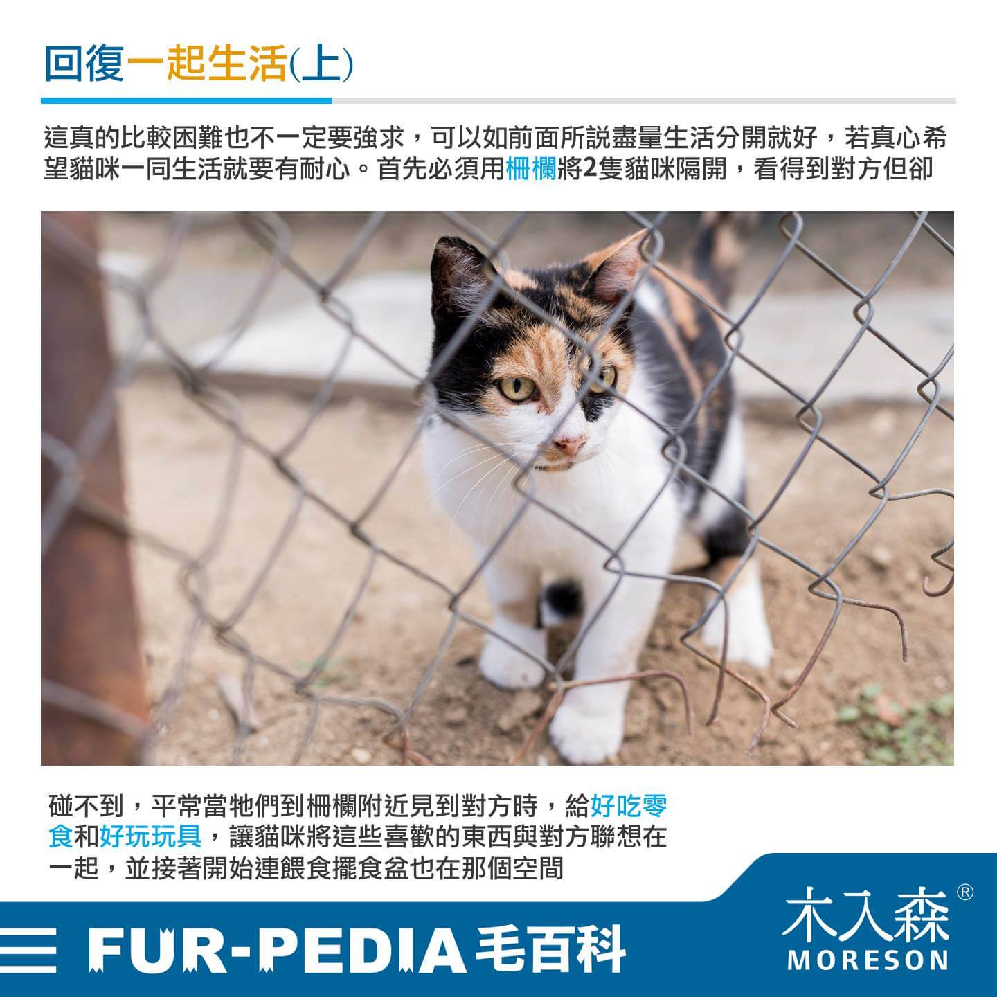 這真的比較困難也不一定要強求,可以如前面所說盡量生活分開就好,若真心希望貓咪一同生活就要有耐心。首先必須用柵欄將2隻貓咪隔開,看得到對方但卻碰不到,平常當牠們到柵欄附近見到對方時,給好吃零食和好玩玩具,讓貓咪將這些喜歡的東西與對方聯想在一起,並接著開始連餵食擺食盆也在那個空間。