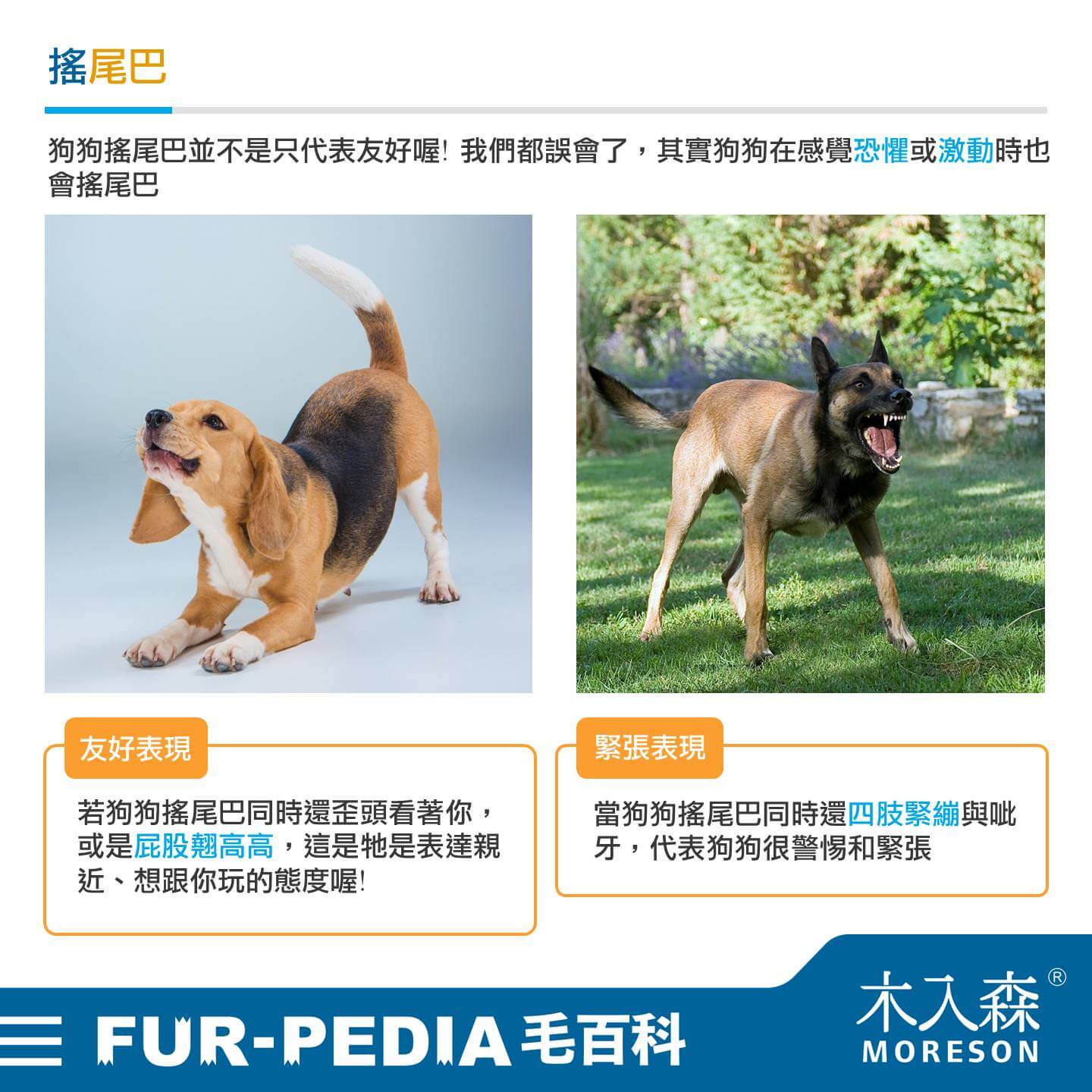 狗狗搖尾巴並不是只代表友好喔! 我們都誤會了,其實狗狗在感覺恐懼或激動時也會搖尾巴。當狗狗搖尾巴同時還四肢緊繃與呲牙,代表狗狗很警惕和緊張。相反,若狗狗搖尾巴同時還歪頭看著你,或是屁股翹高高,這才是牠是表達親近、想跟你玩的態度喔!