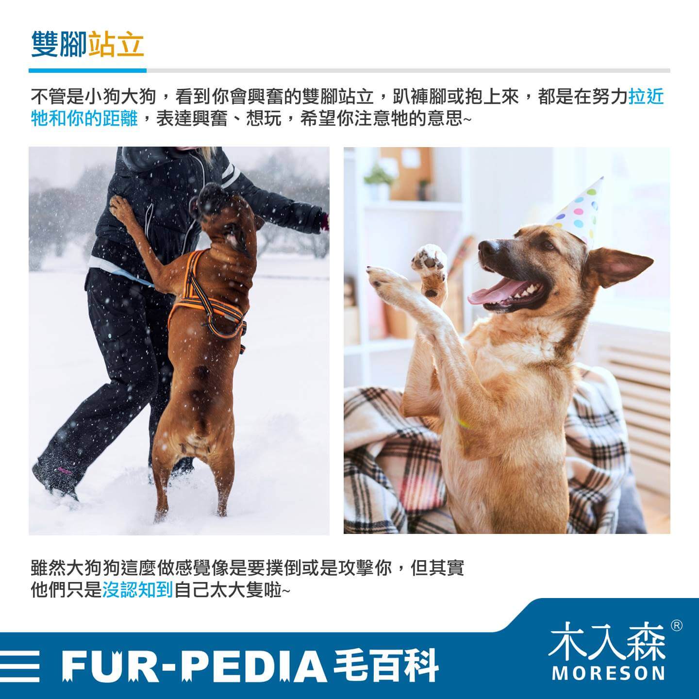 不管是小狗大狗,看到你會興奮的雙腳站立,趴褲腳或抱上來,都是在努力拉近牠和你的距離,表達興奮、想玩,希望你注意牠的意思~ 雖然大狗狗這麼做感覺像是要撲倒或是攻擊你,但其實他們只是沒認知到自己太大隻啦~