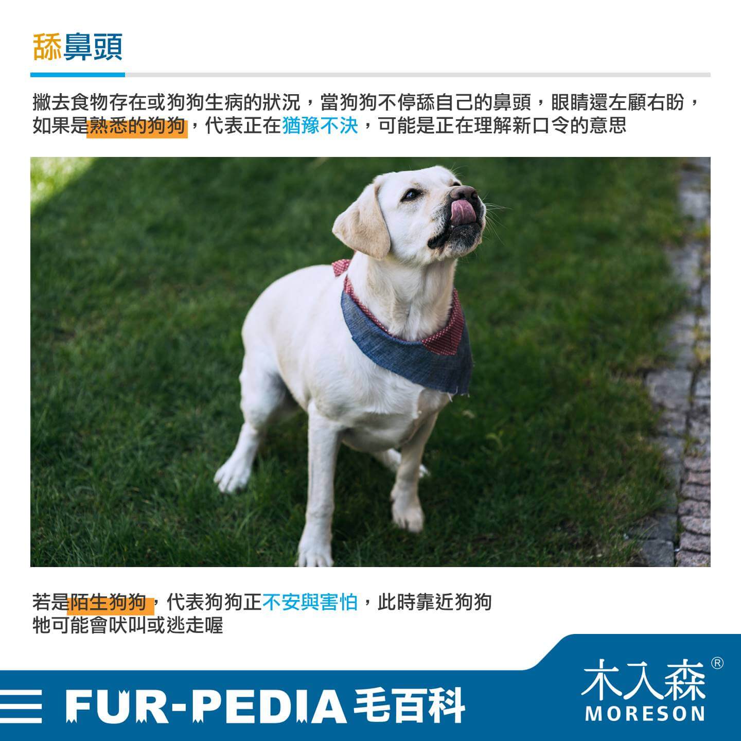 撇去食物存在或狗狗生病的狀況,當狗狗不停舔自己的鼻頭,眼睛還左顧右盼,如果是熟悉的狗狗,代表正在猶豫不決,可能是正在理解新口令的意思;若是陌生狗狗,代表狗狗正不安與害怕,此時靠近狗狗牠可能會吠叫或逃走喔。