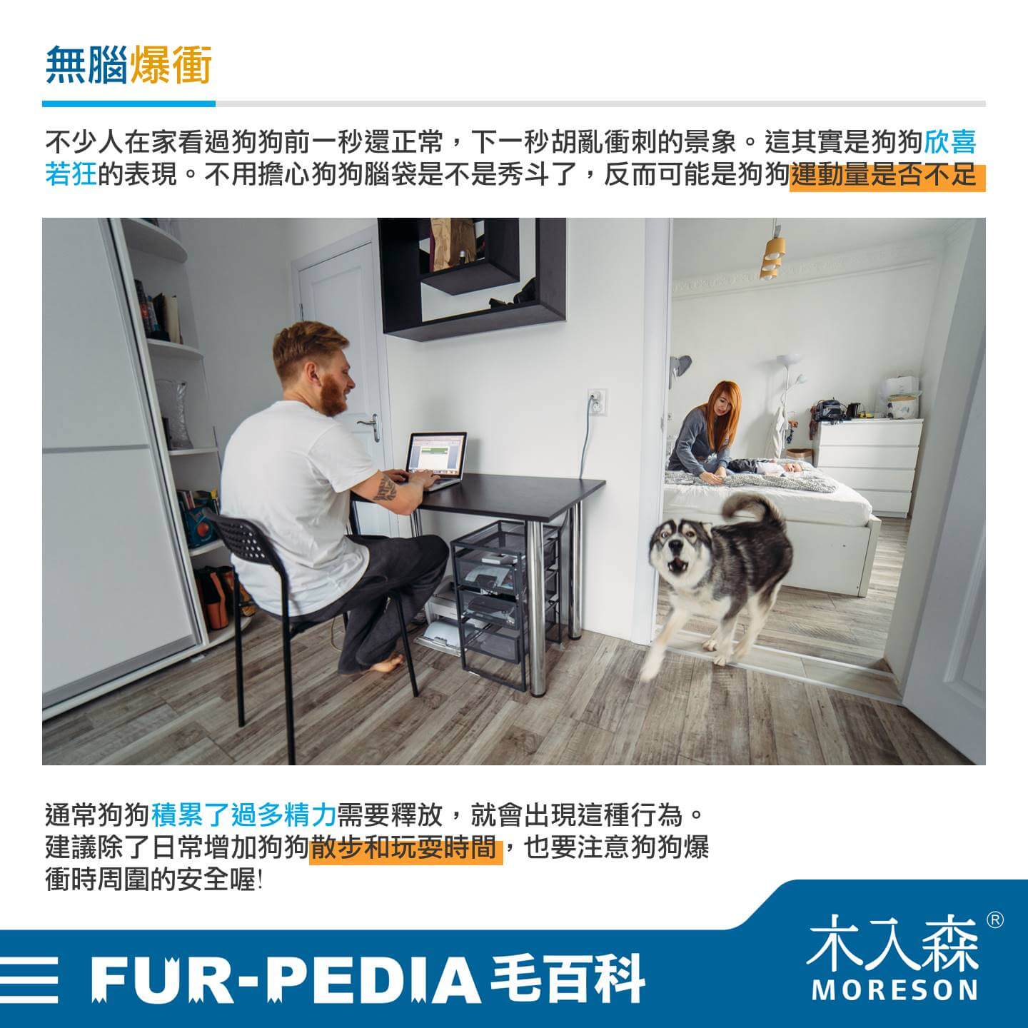 不少人應該在家看過狗狗前一秒還正常,下一秒胡亂衝刺的景象。這其實是狗狗欣喜若狂的表現。主人不用擔心狗狗腦袋是不是秀斗了,反而要思考一下狗狗運動量是否不足,通常狗狗積累了過多精力需要釋放,就會出現這種行為。建議除了日常增加狗狗散步和玩耍時間,也要注意狗狗爆衝時周圍的安全。