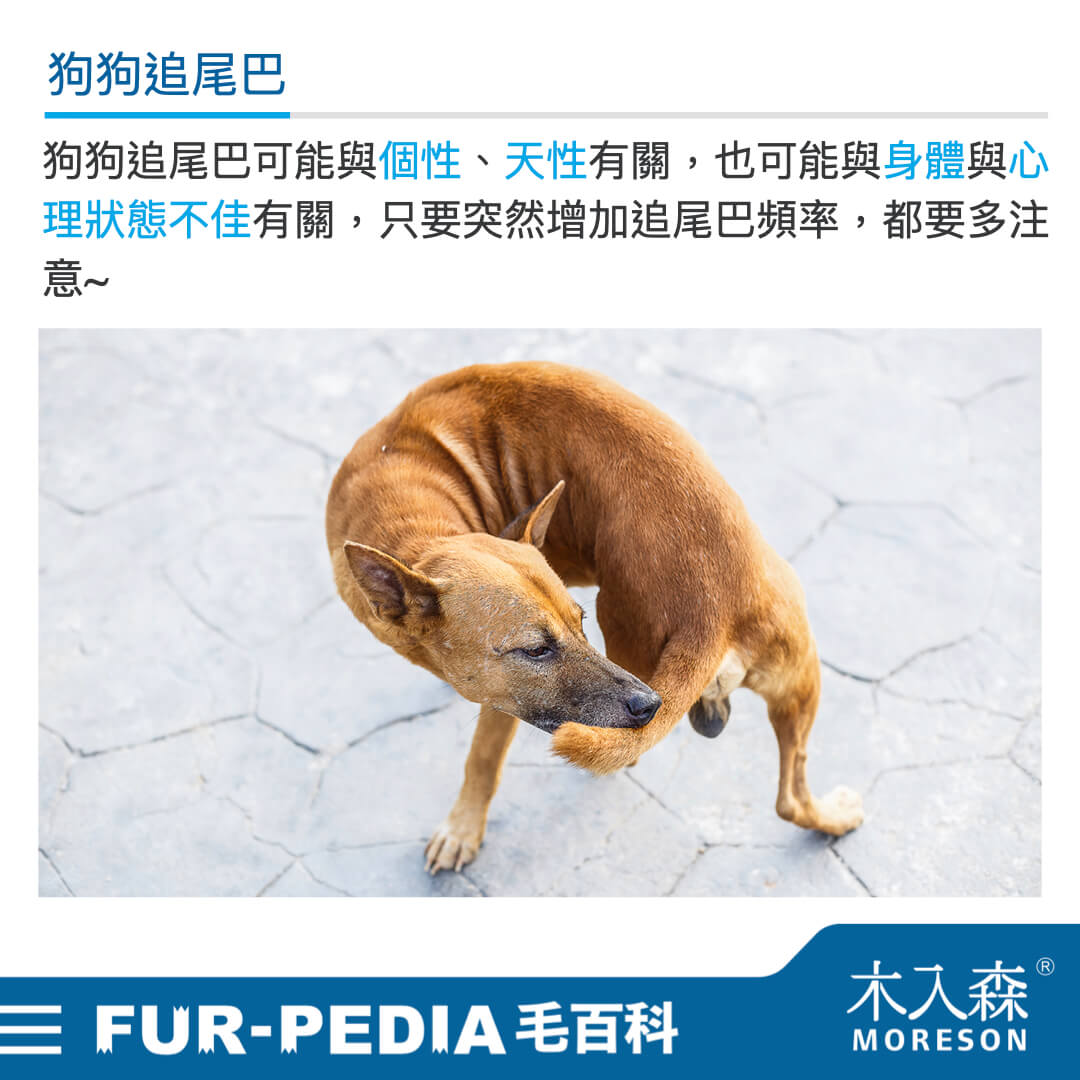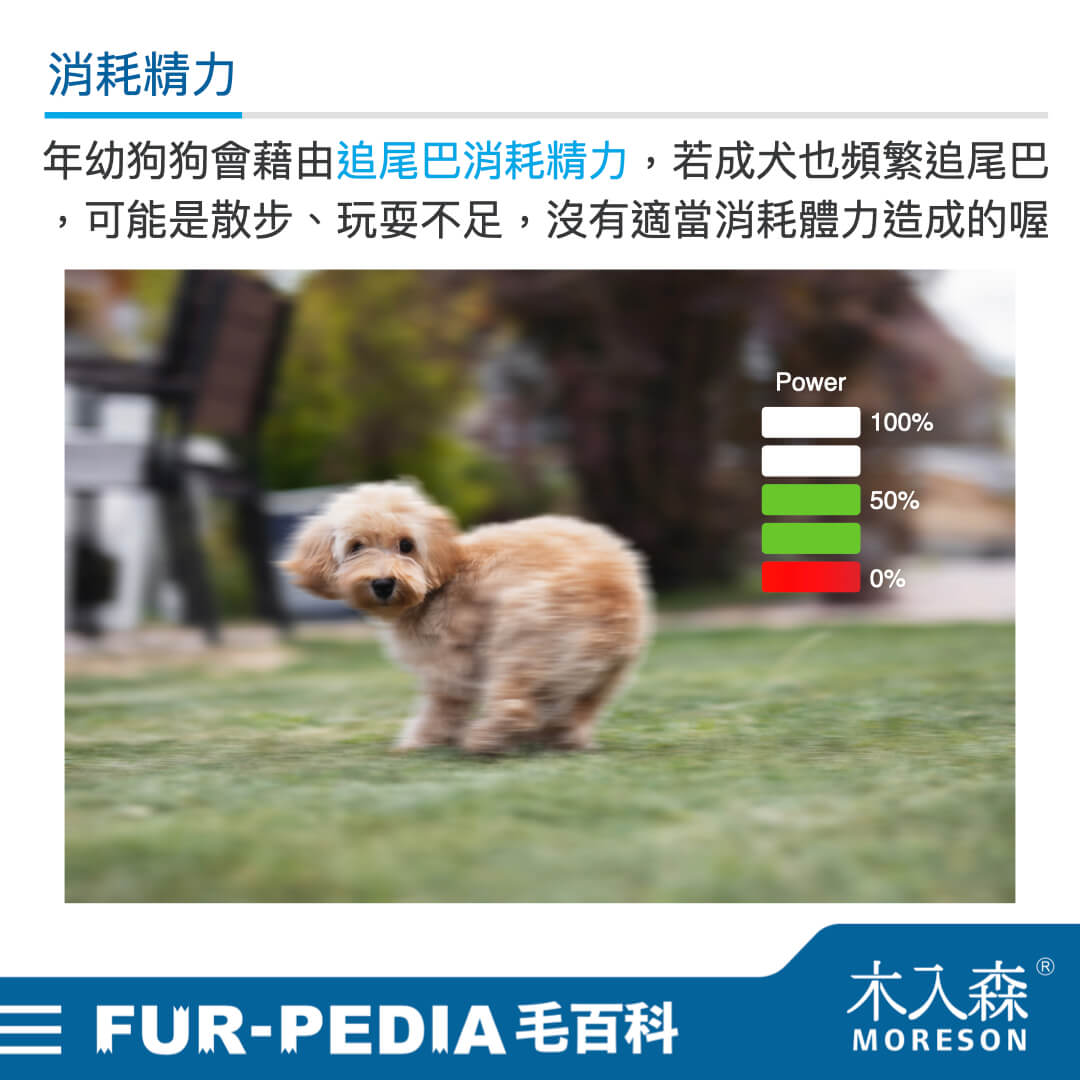 通常我們會最常看到年幼狗狗有追尾巴的行為,那是因為一方面牠們對個體的認知還不完整,會以為是玩伴想一起追逐玩耍,另一方面是年幼的毛孩本來就精力旺盛,這個行為可以幫助牠們釋放精力,隨著長大就會日漸減少。當發現成年狗狗又突然開始追尾巴,要想想是不是帶狗狗出去散步、玩耍的時間變少了? 若沒有正常適當消耗狗狗精力,牠就很有可能出現追尾巴、在家橫衝直撞和破壞家具等行為出現喔~