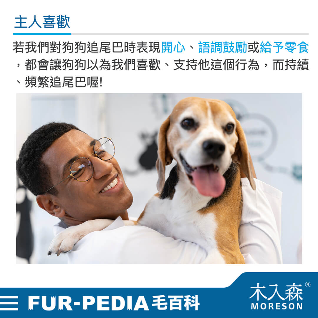 若狗狗平常追尾巴的時候我們很開心地大笑、歡呼,因為覺得很可愛還用類似鼓勵的語調跟狗狗說話,甚至拿出零食餵食讓狗狗以為是做對事情得到獎勵,那很有可能會讓狗狗學習到追尾巴=主人喜歡=表揚,而常常出現追尾巴習慣喔!