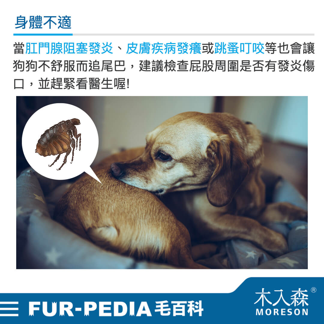 當發現某狗狗某天增加追尾巴頻率了或原本不追尾巴突然開始追了,也要替狗狗檢查一下牠的屁股、尾巴狀況,當肛門腺阻塞發炎、皮膚疾病發癢、跳蚤叮咬等都會讓狗狗不舒服而追啃尾巴,因此除了可能會看見傷口,還可以見到屁股周圍發紅、脫毛、尾巴油膩等,甚至還會有屁股坐在地上磨擦的行為,建議快帶狗狗去看醫生,這代表牠已經很不舒服了。