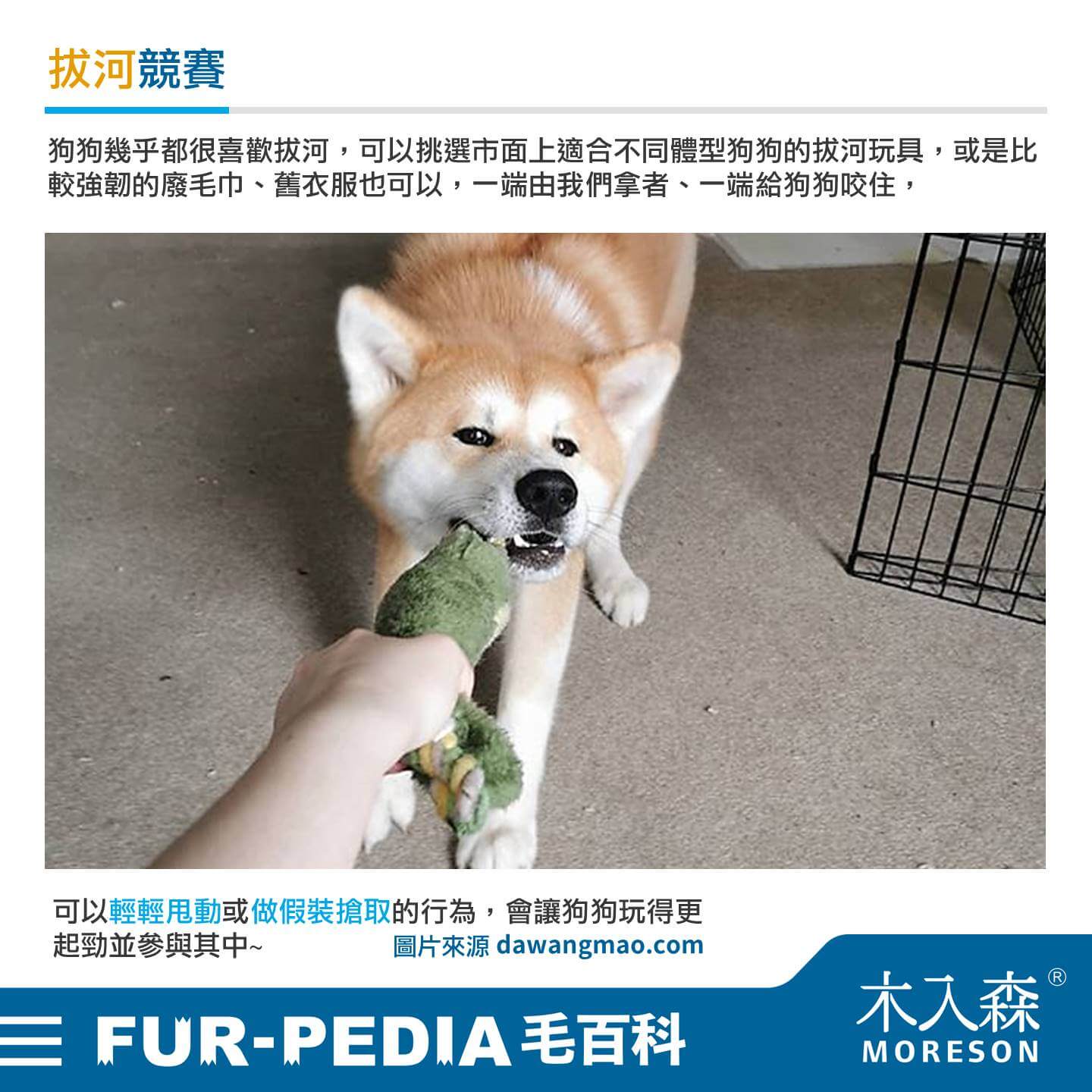 狗狗幾乎都很喜歡拔河,可以挑選市面上適合不同體型狗狗的拔河玩具,或是比較強韌的廢毛巾、舊衣服也可以,一端由我們拿者、一端給狗狗咬住,可以輕輕甩動或做假裝搶取的行為,會讓狗狗玩得更起勁並參與其中~