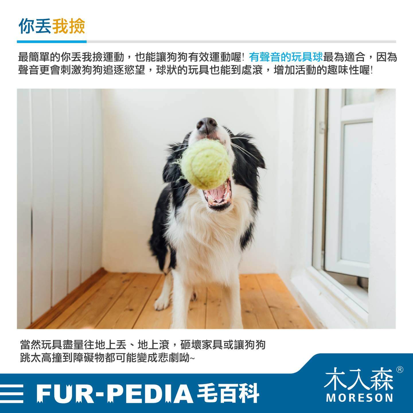 最簡單的你丟我撿運動,也能讓狗狗有效運動喔! 有聲音的玩具球最為適合,因為聲音更會刺激狗狗追逐慾望,球狀的玩具也能到處滾,增加活動的趣味性喔! 當然玩具盡量往地上丟、地上滾,砸壞家具或讓狗狗跳太高撞到障礙物都可能變成悲劇呦~