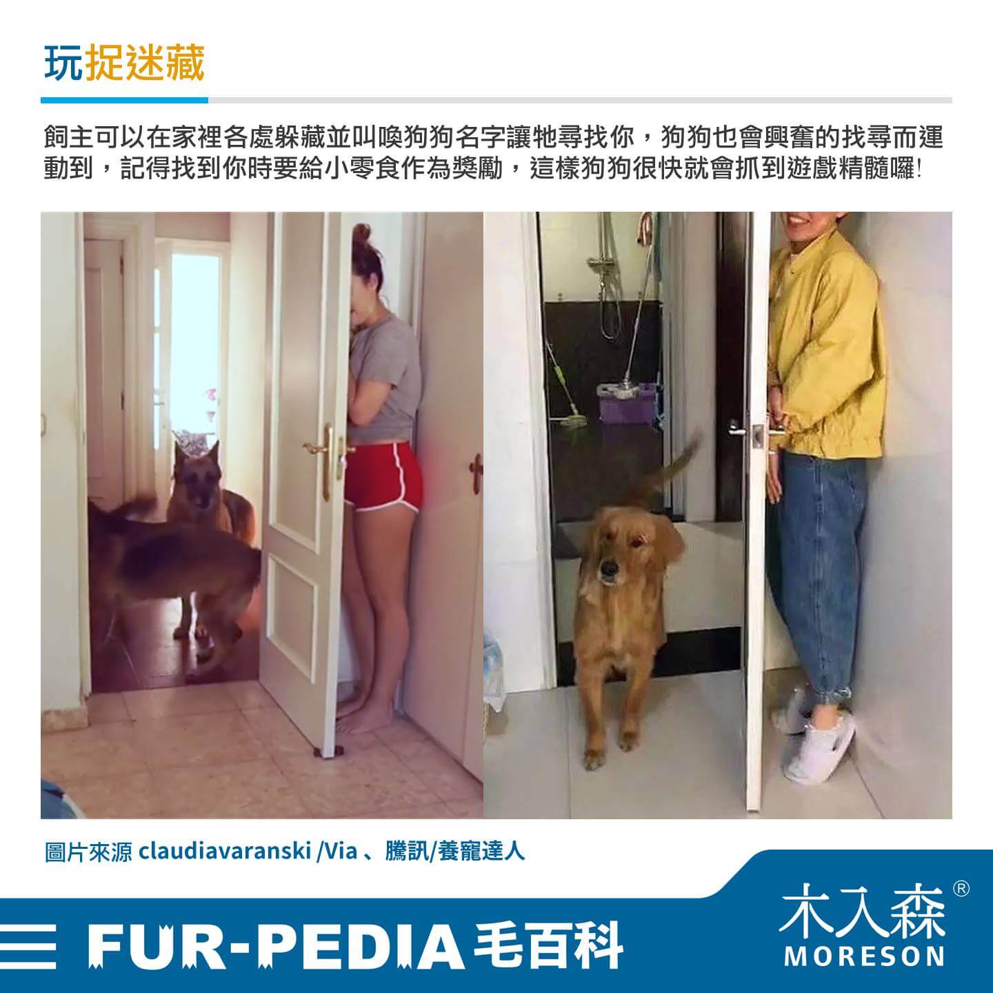飼主可以在家裡各處躲藏並叫喚狗狗名字讓牠尋找你,狗狗也會興奮的找尋而運動到,記得找到你時要給小零食作為獎勵,這樣狗狗很快就會抓到遊戲精髓囉!