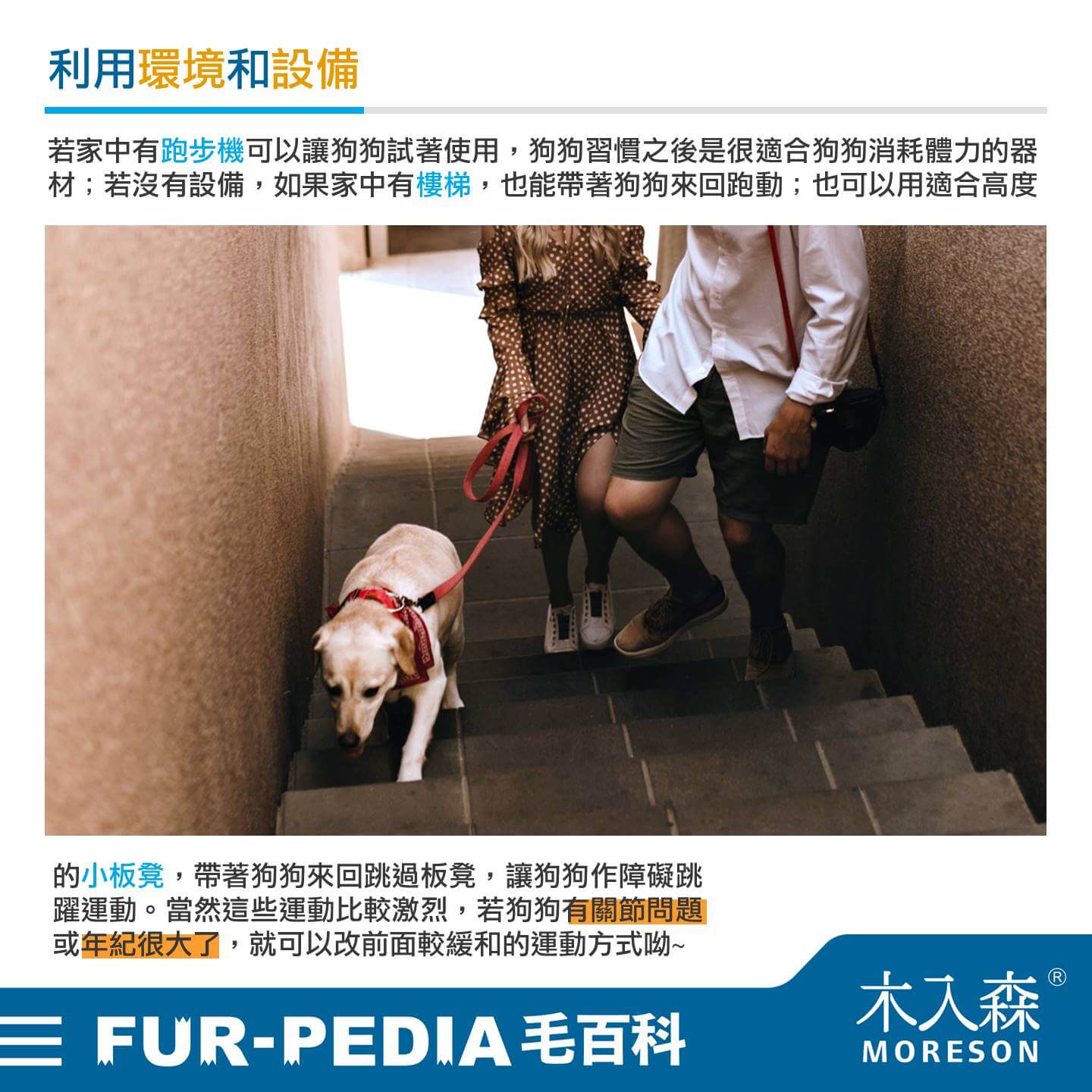 若家中有跑步機可以讓狗狗試著使用,狗狗習慣之後是很適合狗狗消耗體力的器材;若沒有設備,如果家中有樓梯,也能帶著狗狗來回跑動;也可以用適合高度的小板凳,帶著狗狗來回跳過板凳,讓狗狗作障礙跳躍運動。當然這些運動比較激烈,若狗狗有關節問題或年紀很大了,就可以改前面較緩和的運動方式呦~