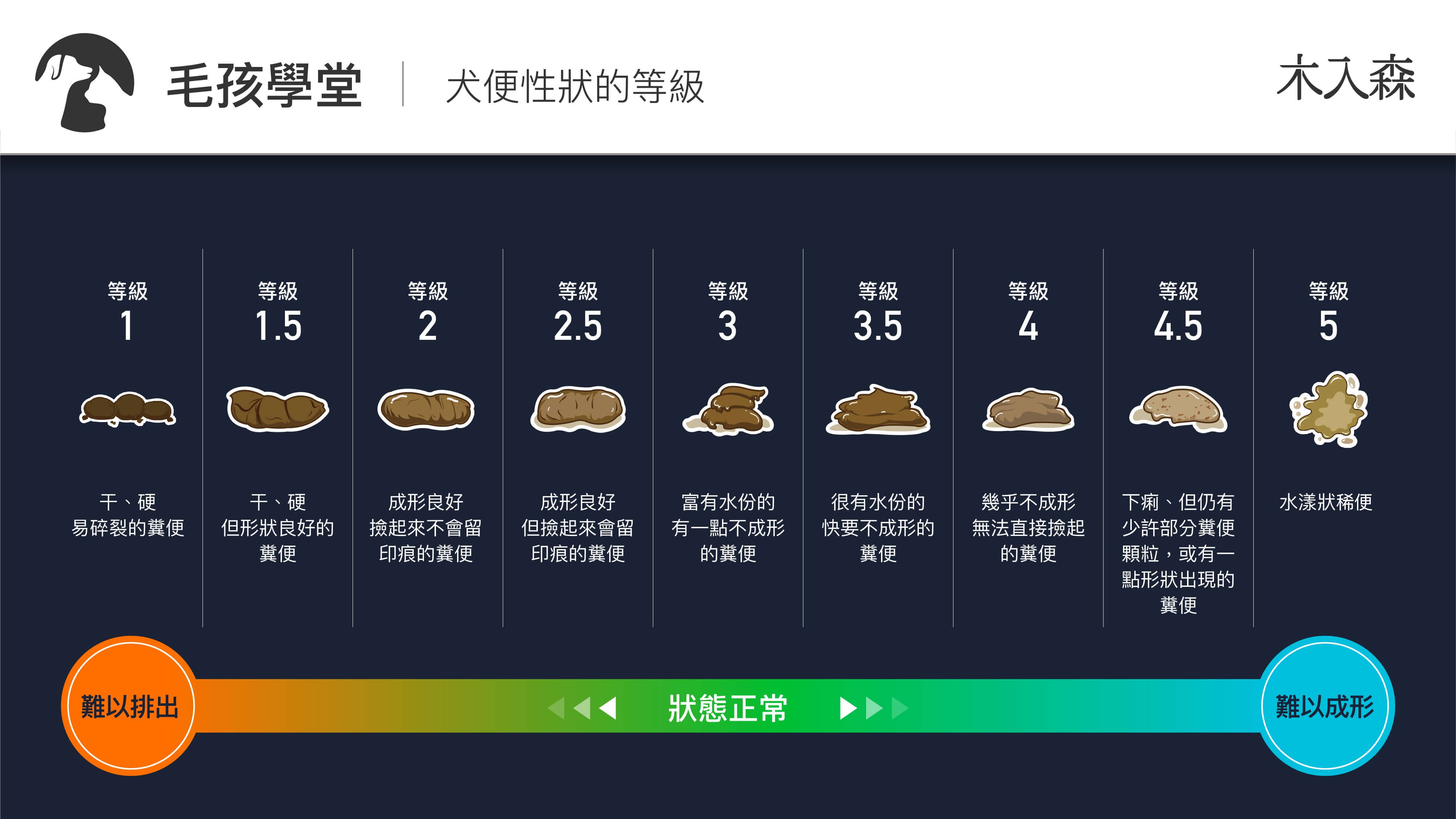 透過以上圖表,已經可以初步知道我們家中狗狗便便的性狀與特徵,接下來,針對不同等級的便便,可以更近一步了解狗狗的身體狀況。