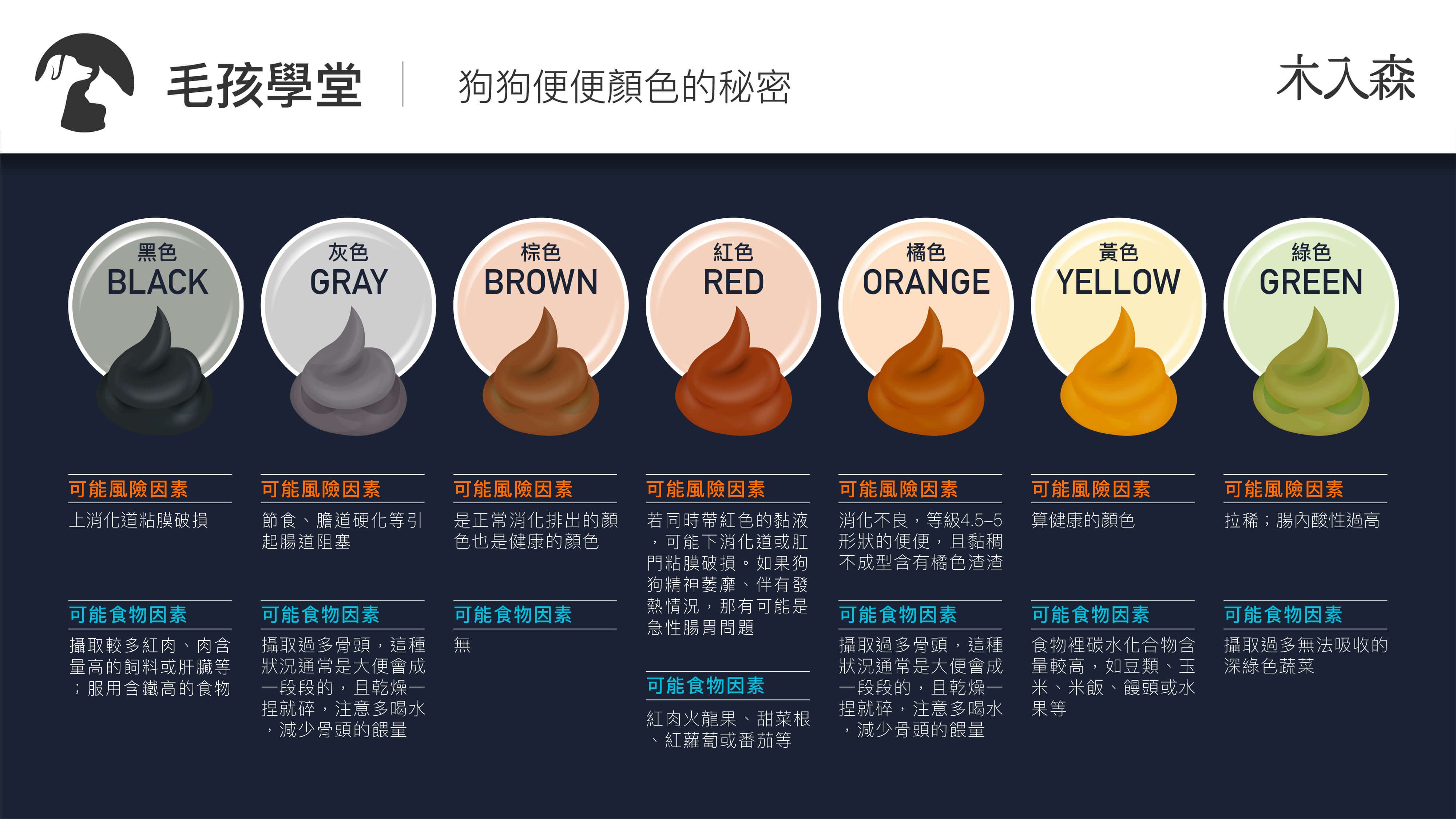 • 可能風險因素:是正常消化排出的顏色也是健康的顏色。