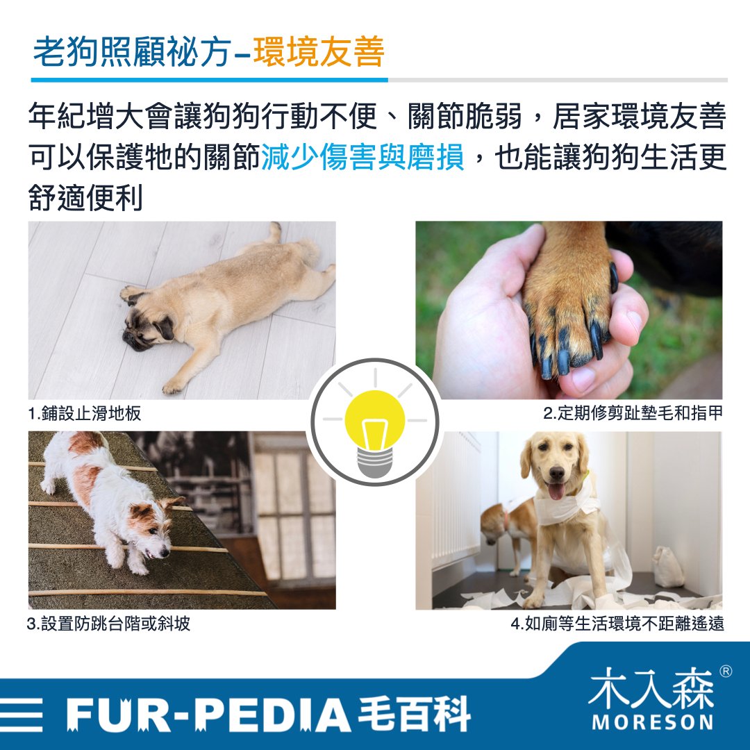 年紀增大會讓狗狗「行動不便」、「關節脆弱」,居家環境的友善可以保護牠的關節減少「傷害」與「磨損」,也能讓狗狗生活更舒適便利。