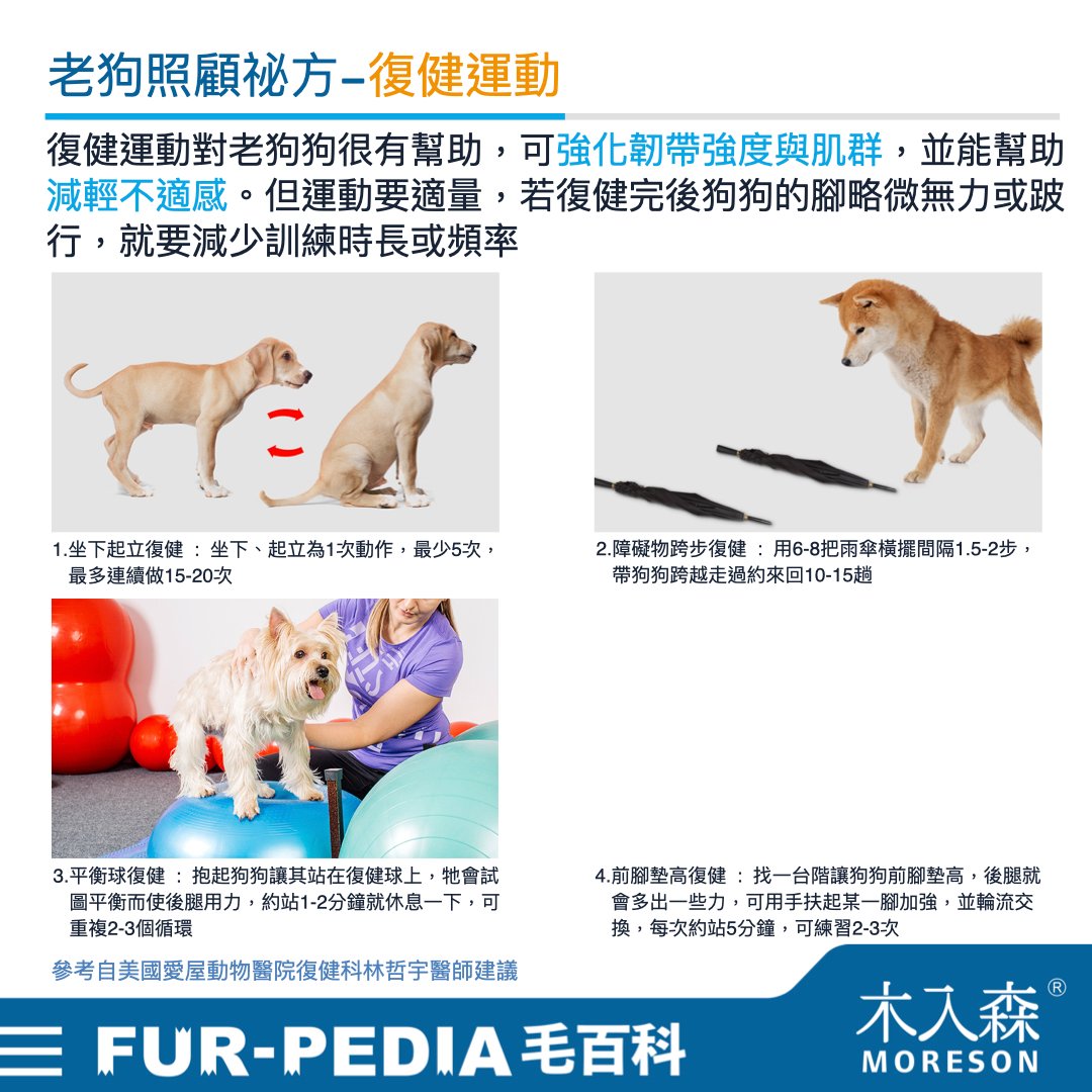 許多復健科獸醫師都在宣導「復健運動」對老狗狗很有幫助,不僅不會造成關節損傷,還可強化牠們的「韌帶強度」與「肌群」,增加腳部的神經刺激,甚至能幫助緩和、減輕不適感。