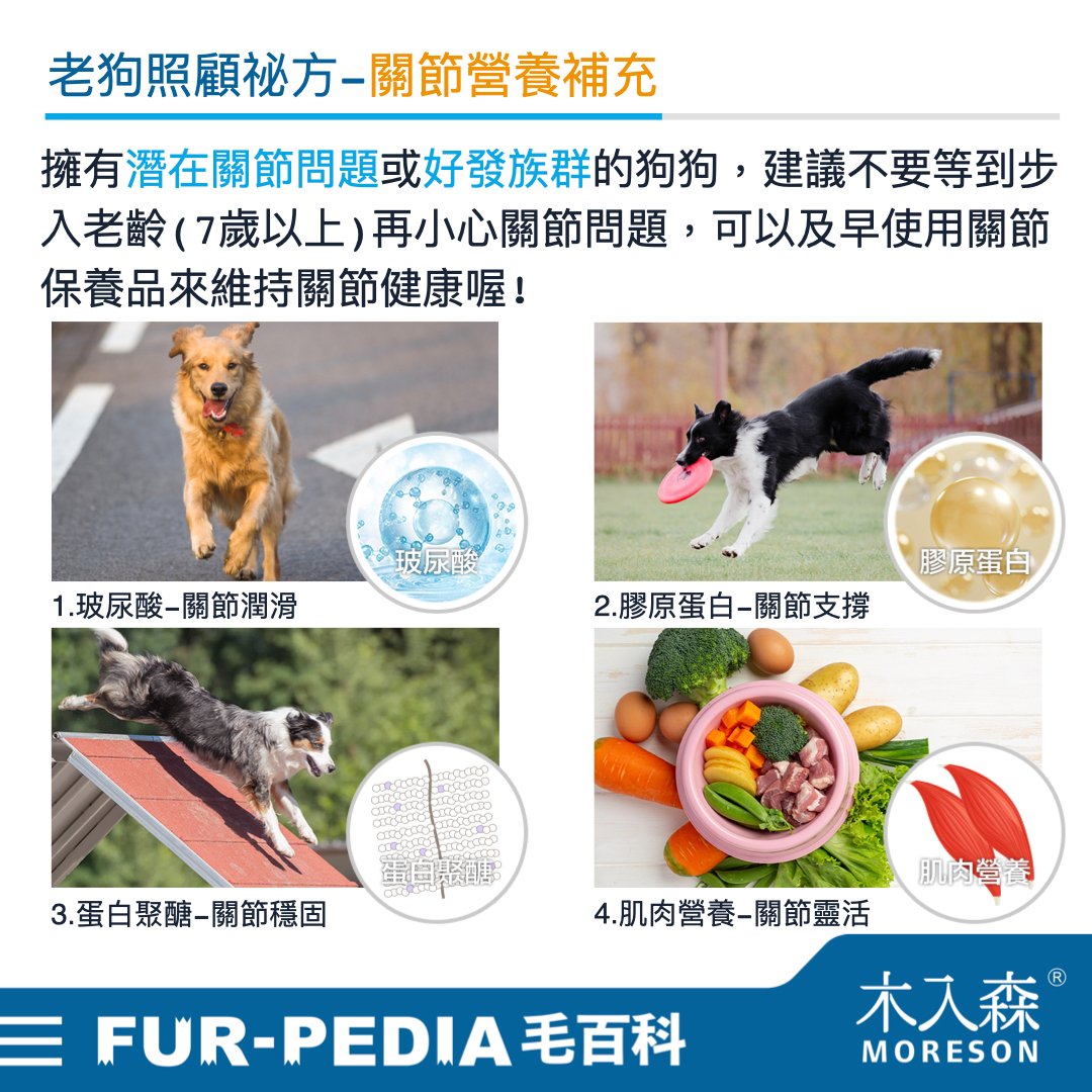 希望較「有效」、「有感」的保養狗狗關節,可以選擇補充「玻尿酸」為主。 - 膠原蛋白:是關節「軟骨」最主要的組成物,如同「鋼筋」一樣可支撐保護關節,選擇「胜肽小分子」可以讓狗狗身體吸收與合成更容易。參考資料[2]