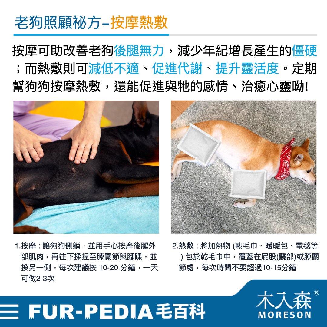 根據美國獸醫分析,「按摩」是可以幫助改善老狗後腿無力的狀況,並減少因年紀增加而產生的僵硬,進而提升肌肉強度。參考資料[5]