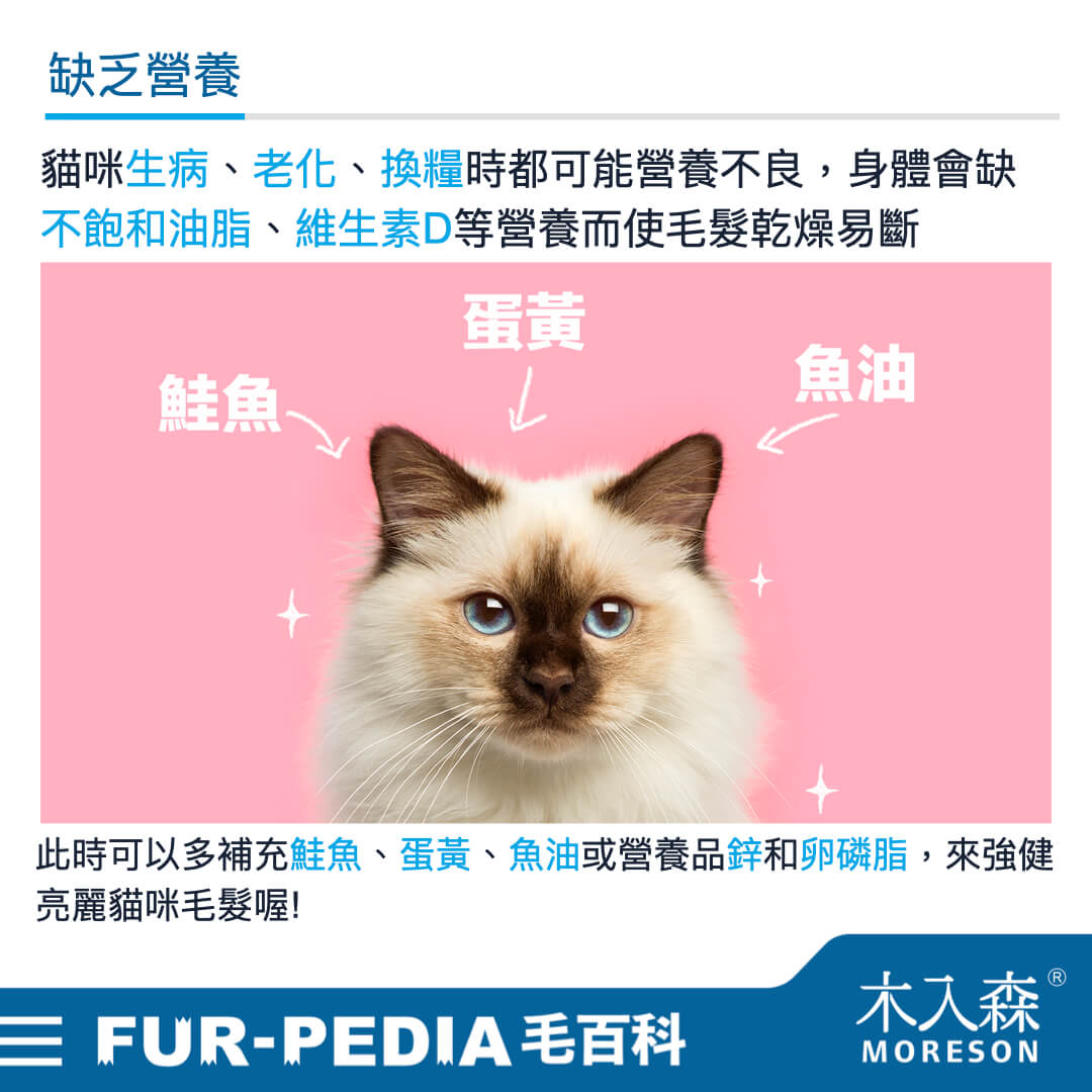 貓咪很多時候都會遇到營養不良,例如生病時、年老吸收不佳時、換糧時等,當缺乏足夠的不飽和油脂、維生素D等就容易讓貓咪毛髮乾巴巴、易斷又打結,此時可以讓貓咪在非正午時段多曬曬太陽,並多補充鮭魚、雞蛋黃或魚油來幫助強健毛髮,也可挑選營養品補充鋅和卵磷脂來幫助毛髮生長與亮麗喲!