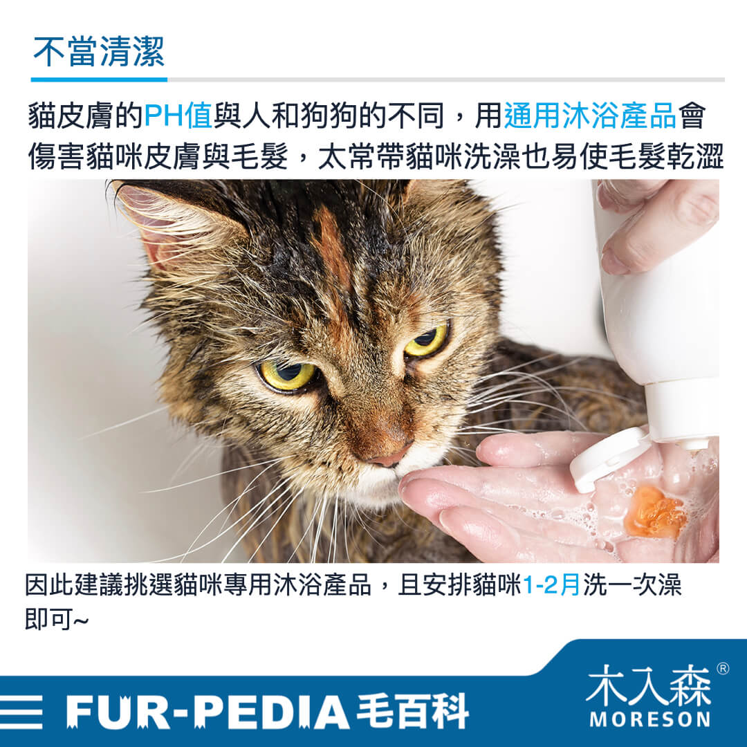 貓咪的皮膚PH值與人類和狗狗的均不相同,用通用的沐浴產品其實會對貓咪皮膚傷害很大,長時間使用下來會越洗皮膚越紅癢、毛髮越粗糙乾澀,因此建議要挑選貓咪專用的沐浴產品,且也不要過度頻繁安排貓咪洗澡,會洗掉大半保護貓咪皮毛和皮膚的油脂,這些油脂分泌物中含有毛髮和皮膚所需要的微量元素,經常洗澡會破壞這種平衡,大約1-2月洗一次即可~