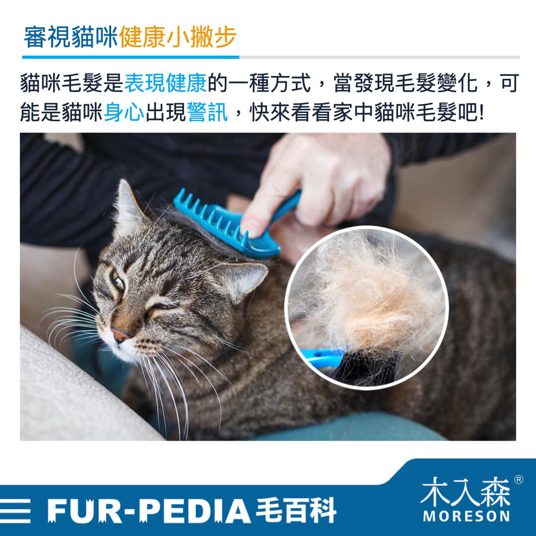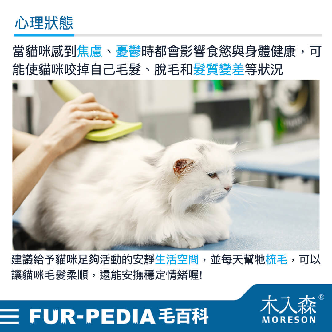 不要小看貓咪的情緒,當貓咪感到焦慮、緊張或憂鬱時都會使貓咪處在不安的狀態,進一步影響食慾與身體健康,可能使貓咪咬掉自己毛髮、過度舔毛、自動脫毛和髮質變差等狀況。建議一定要觀察貓咪生活環境,給予足夠活動且有私人領域的安靜生活空間,並盡量每天幫貓咪梳毛1-2次,這樣不僅能讓貓咪毛髮更柔順、少打結,還能與貓咪培養感情,對安撫牠的情緒也很有幫助。