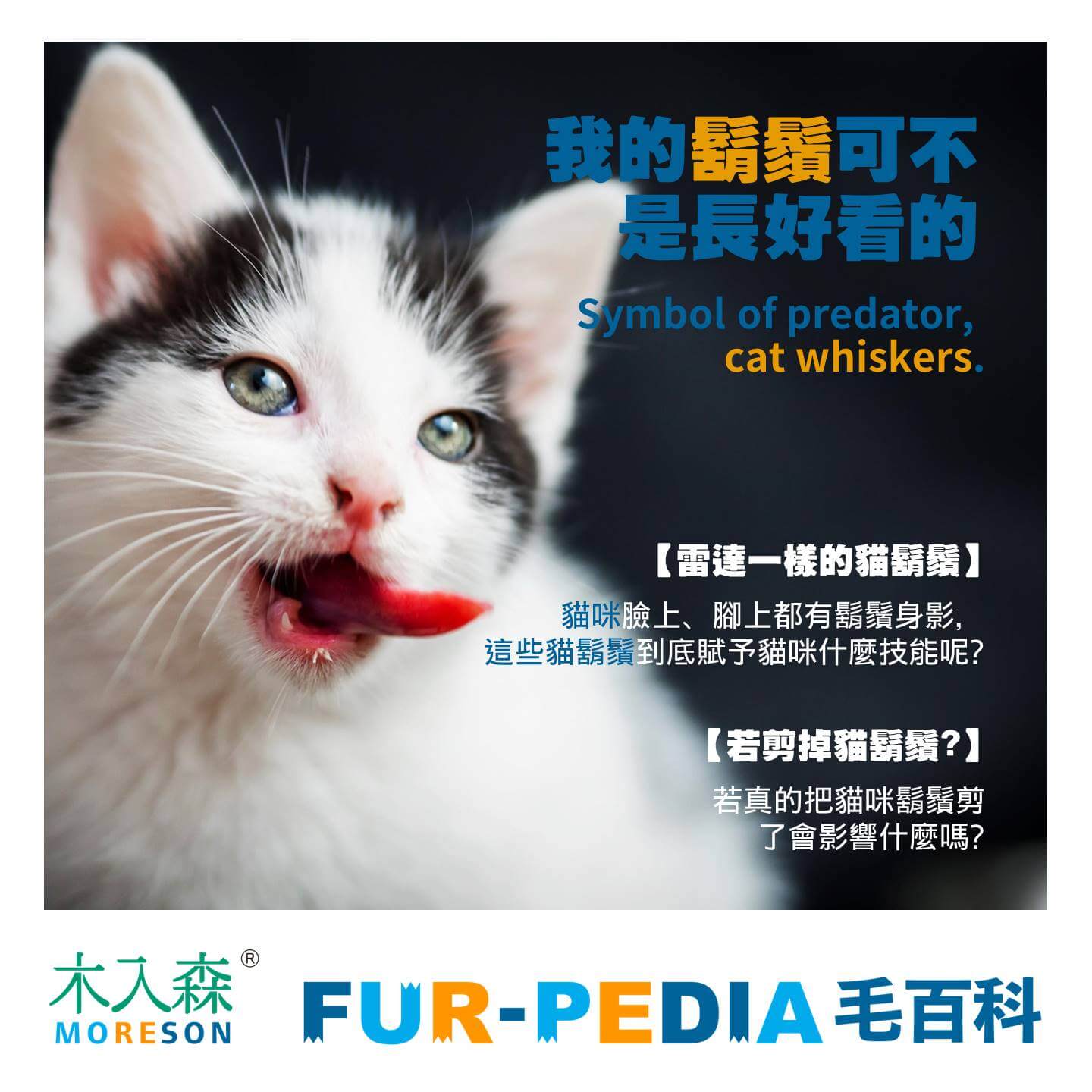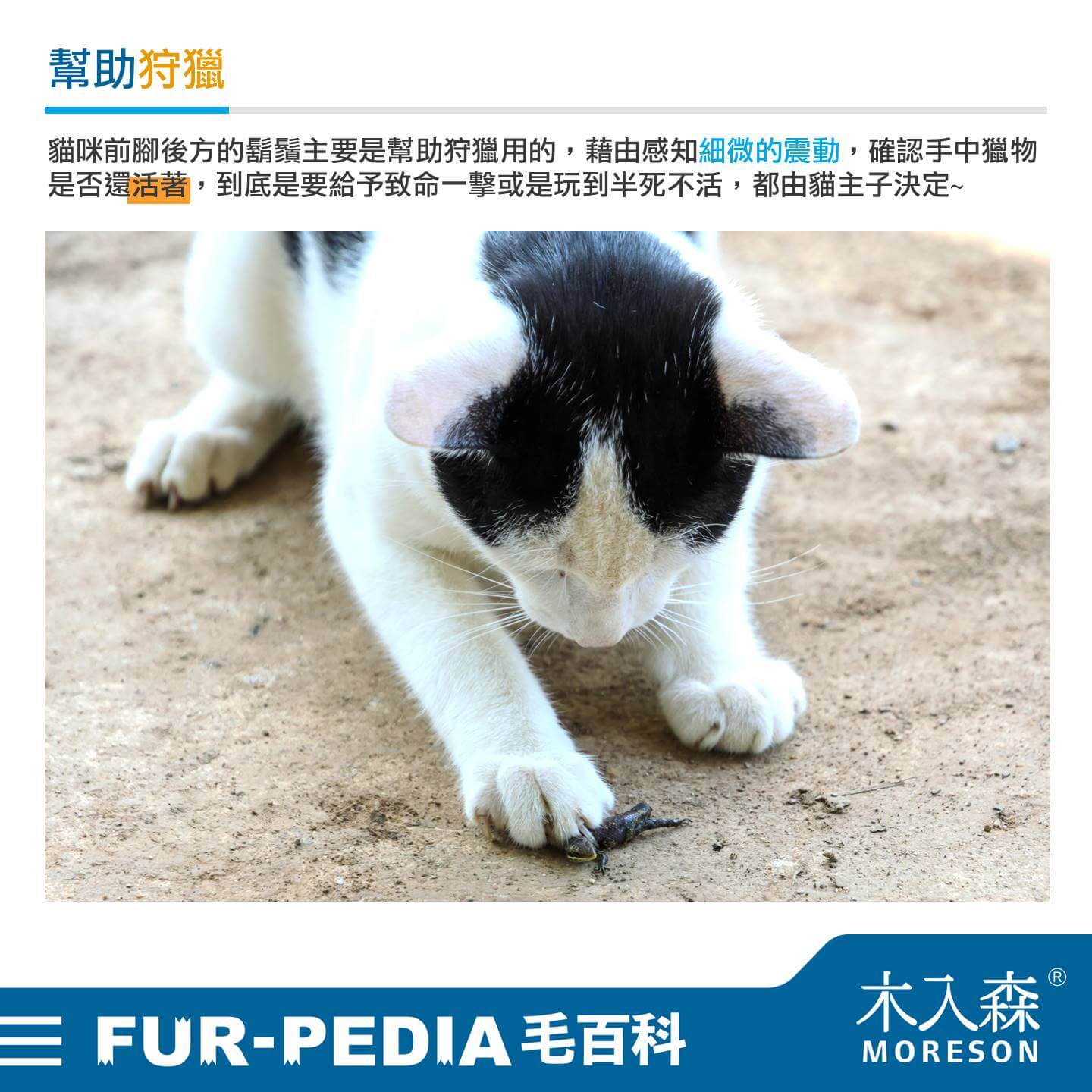 貓咪前腳後方的鬍鬚主要是幫助狩獵用的,藉由感知細微的震動,確認手中獵物是否還活著,到底是要給予致命一擊或是玩到半死不活,都由貓主子決定~