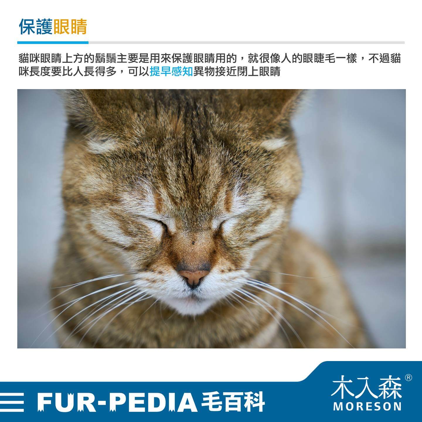 貓咪眼睛上方的鬍鬚主要是用來保護眼睛用的,就很像人的眼睫毛一樣,不過貓咪長度要比人長得多,可以提早趕知異物接近閉上眼睛。