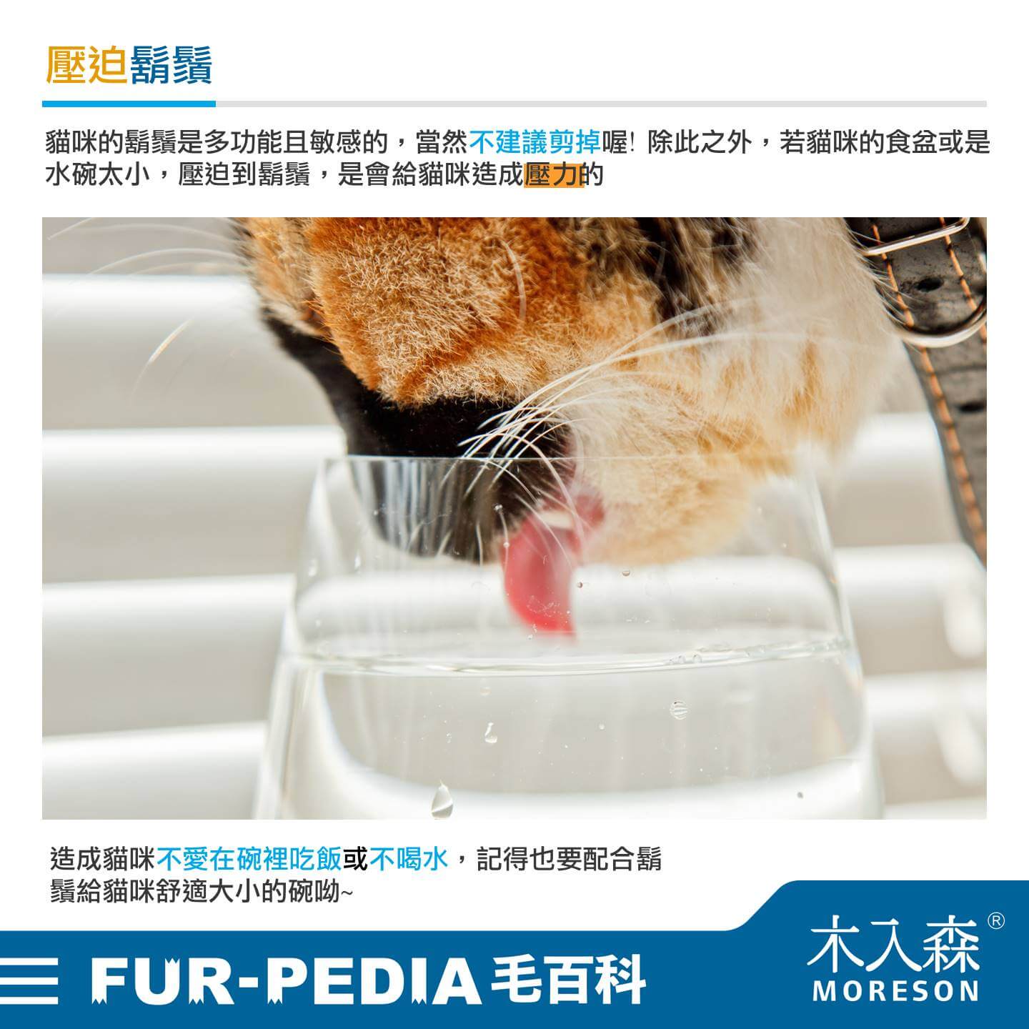 貓咪的鬍鬚是多功能且敏感的,當然不建議剪掉喔! 除此之外,若貓咪的食盆或是水碗太小,壓迫到鬍鬚,是會給貓咪造成壓力的,造成貓咪不愛在碗裡吃飯或不喝水,記得也要配合鬍鬚給貓咪舒適大小的碗呦~