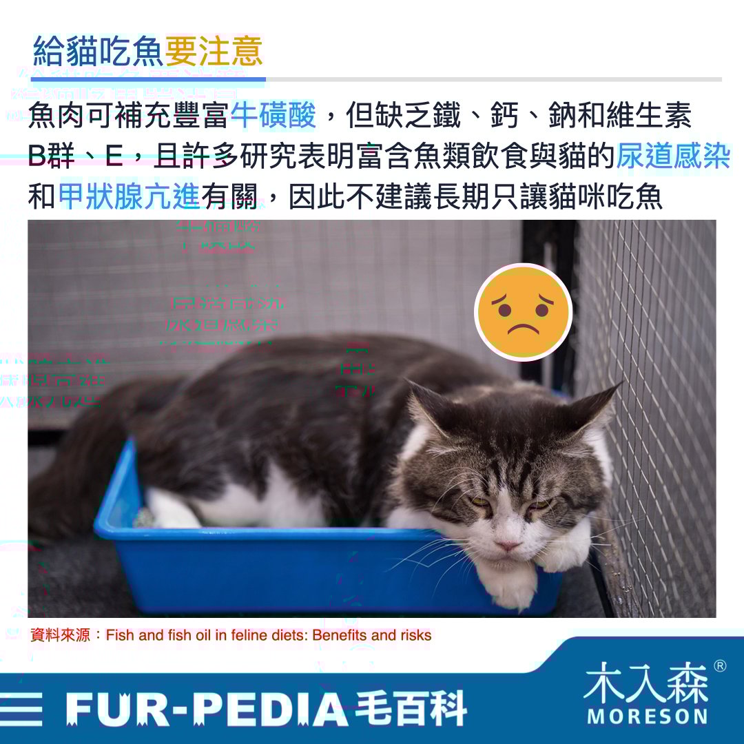 但魚類也缺乏鐵、鈣、鈉和維生素B群、E,且許多研究表明「富含魚類的飲食」與貓的「尿道問題」和「甲狀腺問題」有關,因此不建議長期只讓貓咪吃魚。參考資料[3][4]