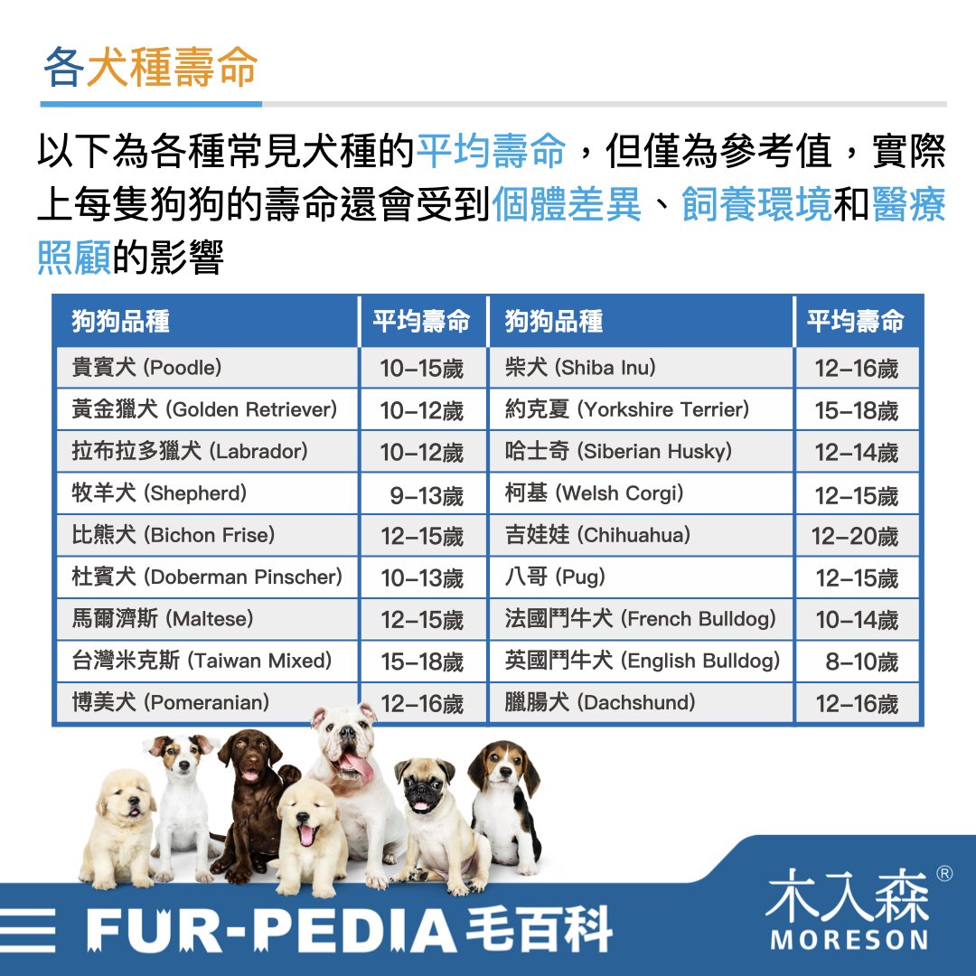但要記得這僅為「平均壽命」,實際上每隻狗狗的壽命還受到「個體差異」、「飼養環境」和「醫療照顧」的影響。