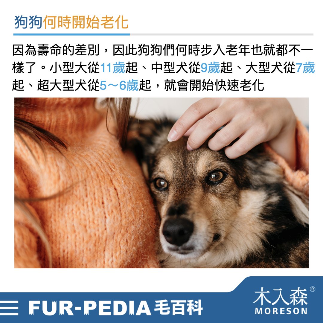 「小型犬」從 11 歲起、「中型犬」從 9 歲起、「大型犬」從 7 歲起、「超大型犬」從 5~6 歲起,就會開始快速老化。