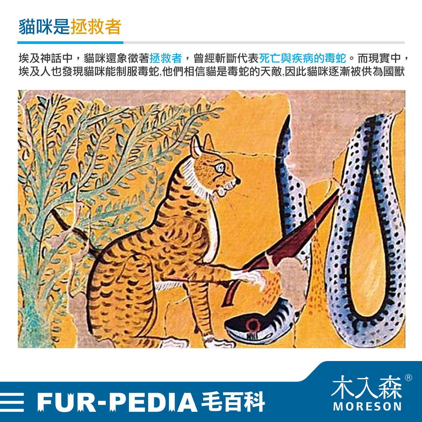埃及神話中,貓咪還象徵著拯救者,曾經斬斷代表死亡與疾病的毒蛇。而現實中,埃及人也發現貓咪能夠制服毒蛇,他們相信貓是毒蛇的天敵,因此貓咪逐漸被供為國獸。