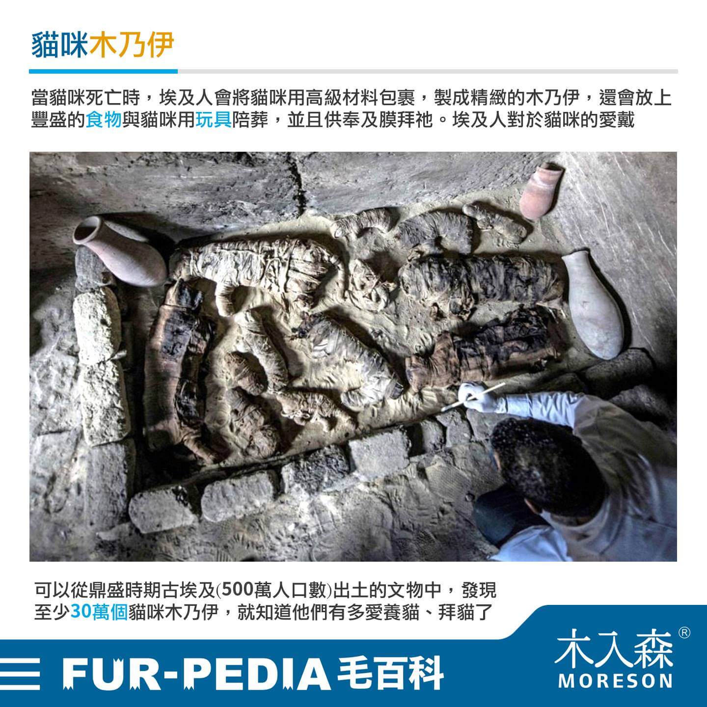 當貓咪死亡時,埃及人會將貓咪用高級材料包裹,製成精緻的木乃伊,還會放上豐盛的食物與貓咪用玩具陪葬,並且供奉及膜拜祂。埃及人對於貓咪的愛戴,可以從鼎盛時期古埃及(500萬人口數)出土的文物中,發現至少30萬個貓咪木乃伊,就知道他們有多愛養貓、多愛拜貓了。
