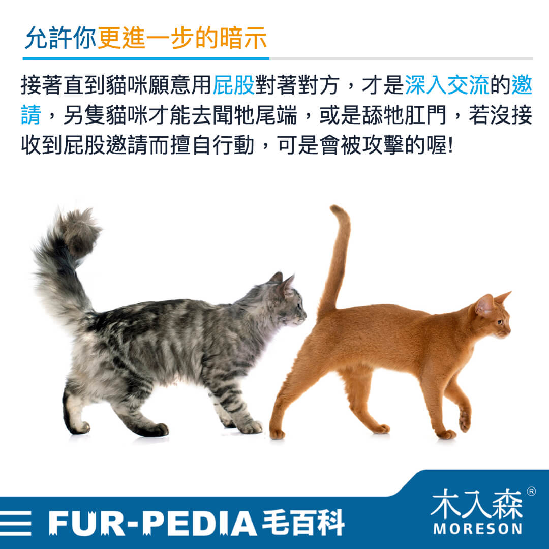 前面都是貓咪的友好招呼,並不是可以深入交流的邀請喔! 直到什麼暗示對方才能進一步呢? 那就是當貓咪蹭完後,牠願意轉身用屁股對著對方,另隻貓咪才能去聞牠尾端的信息素,或是去舔牠肛門周圍,此時貓咪是表示「我喜歡你喔~來吧!」。當然若貓咪在招呼後沒有這個邀請動作,對方就跑去聞牠尾部(侵犯牠私領域),就很可能會激怒貓咪,突然翻臉攻擊~
