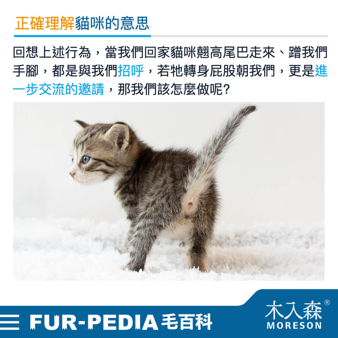 所以我們人呢? 總不能真的去舔貓咪肛門吧!? 當然不是喔~ 我們可以試著回想一下,當我們一回到家,貓咪是不是尾巴翹高走過來,這就是與我們Say Hi,並接著呢用臉或身側去磨蹭我們的手跟腳,傳遞氣味給你,接著崇高地轉身背對我們,此時並不是不想理會我們喔! 恰恰相反,牠正在說「來吧! 允許你深入交流~」,貓咪雖然是示意我們可以更進一步,但不是說可以摸我、抱我,所以千萬不是這個時候大力去撸貓、抱起牠來吸聞的時候喔!